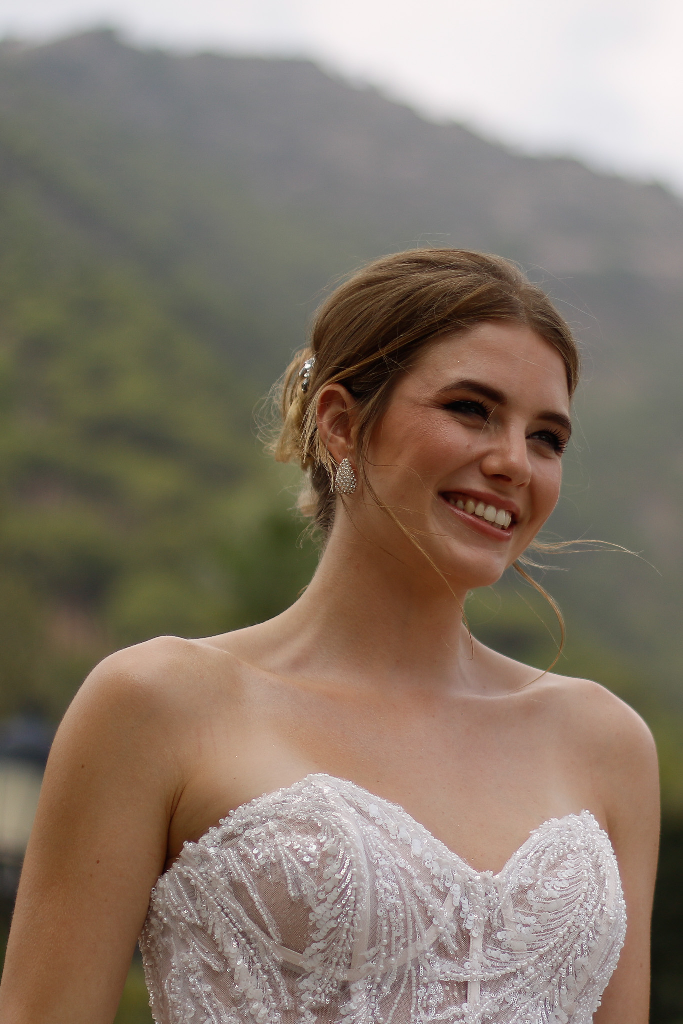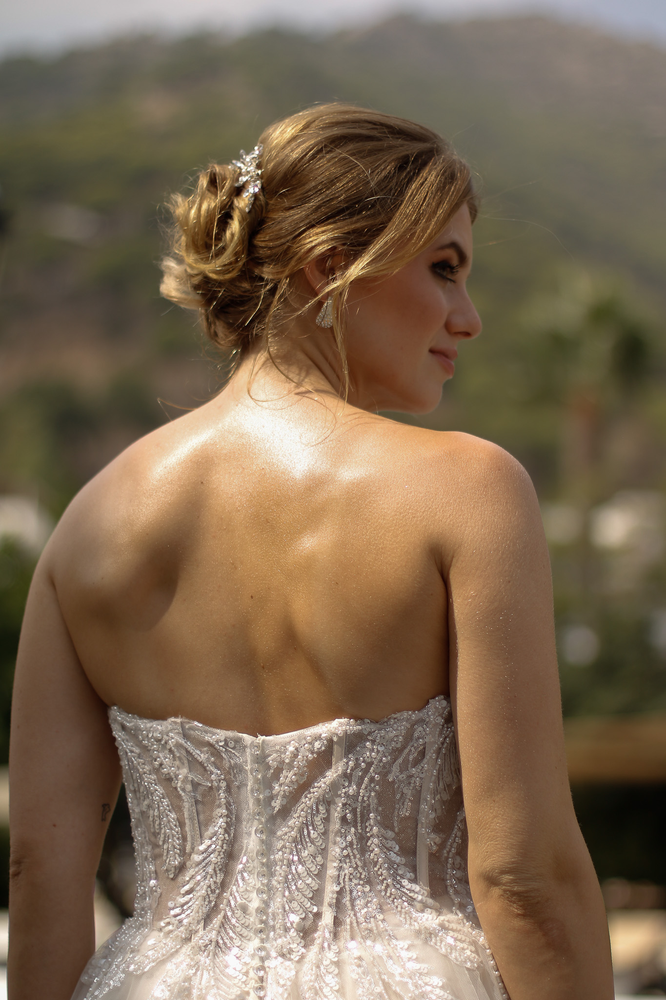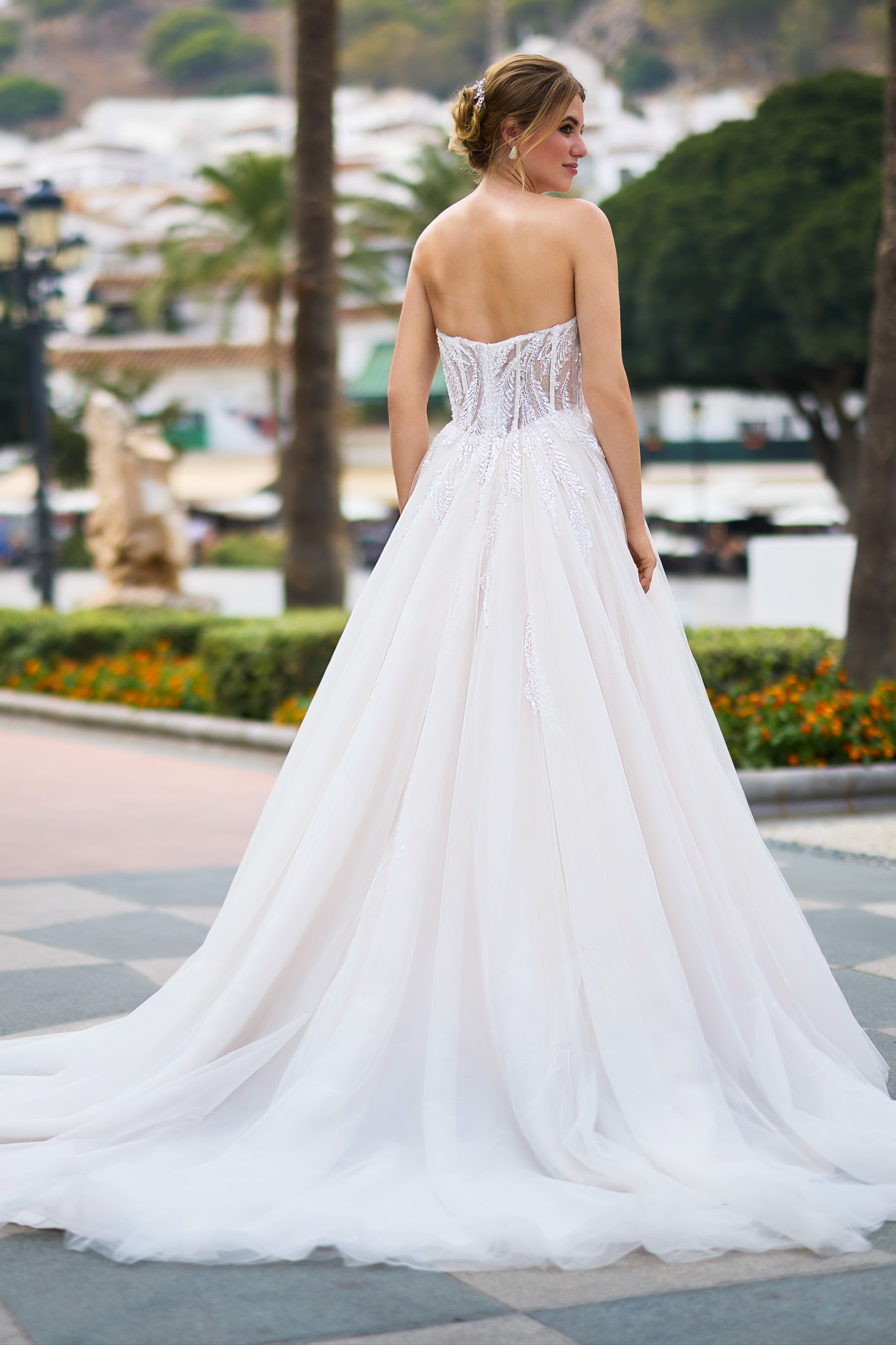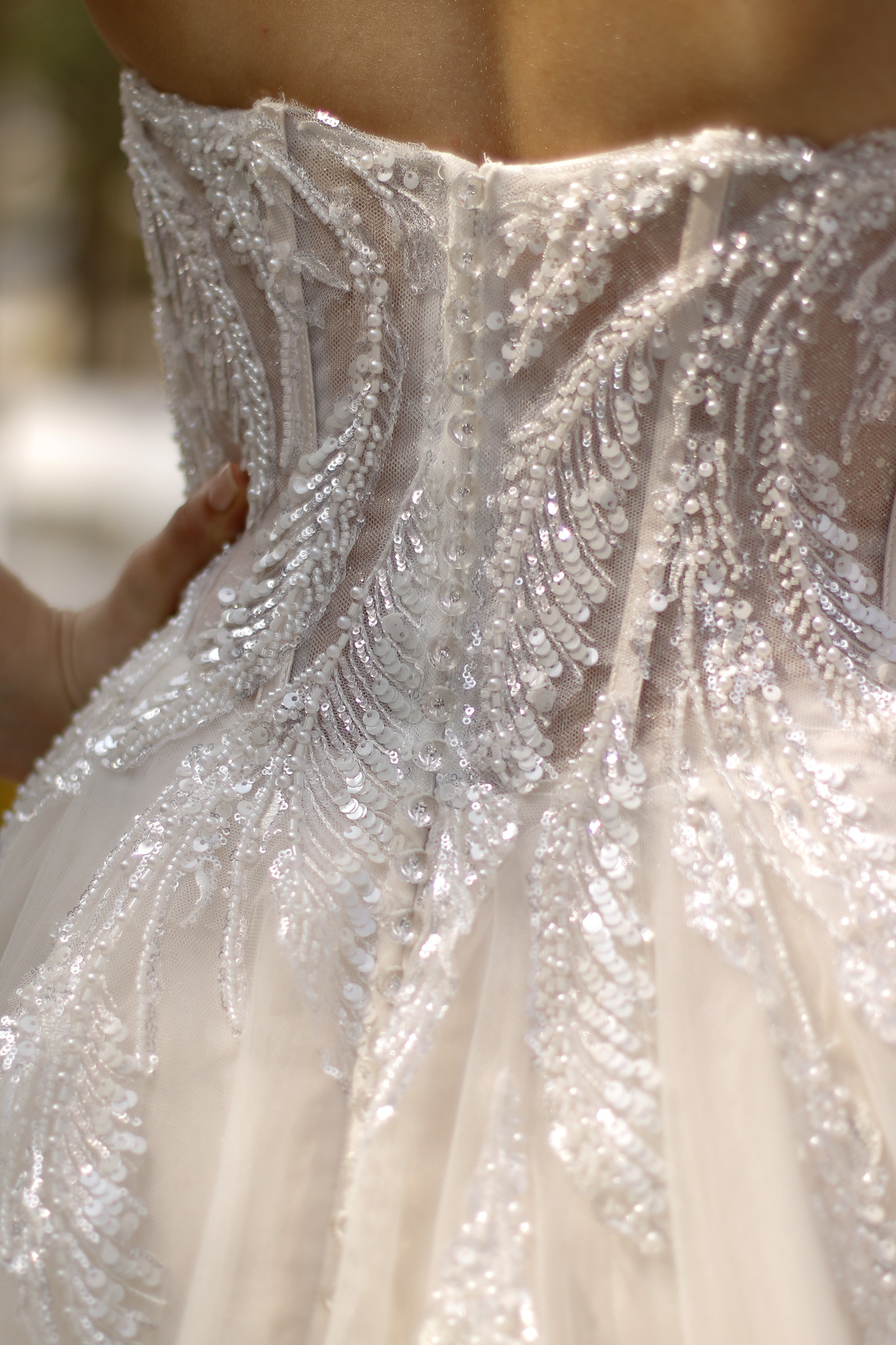 Dieses luxuriöse Brautkleid ist mit einem Korsett-Oberteil mit herzförmigem Ausschnitt und eleganten glänzenden Details und Perlen verziert, die über den Rock verlaufen. Eine zauberhafte, weich fließende Schleppe aus mehreren Lagen Tüll und Organza rundet den Look des Kleides wunderschön ab. Alle Materialdetails anzeigen