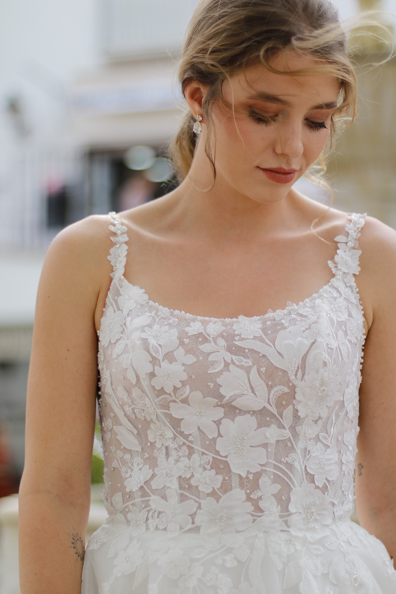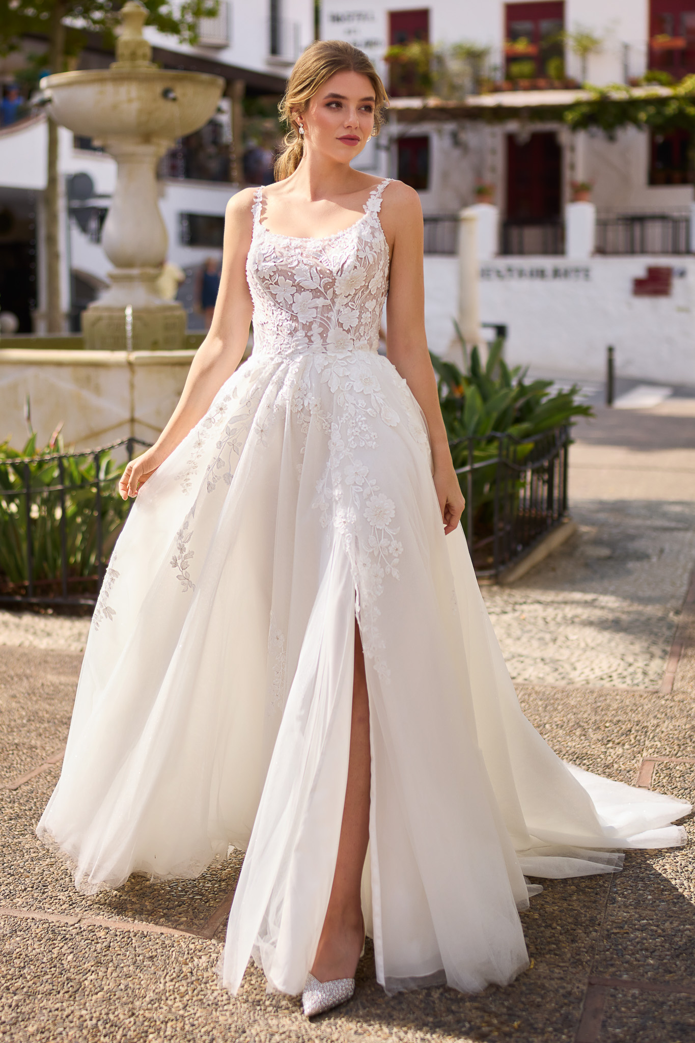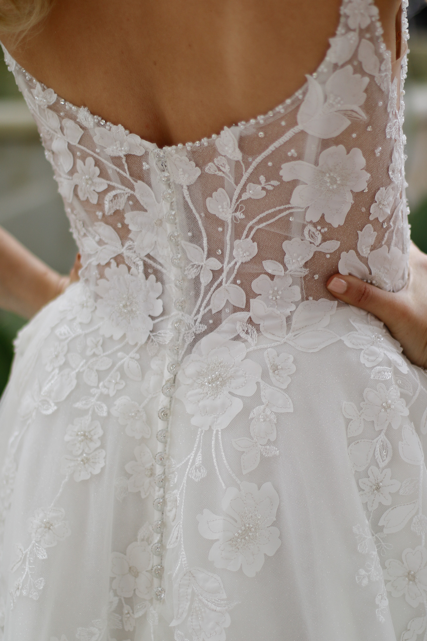 Dieses elegante und traditionelle Brautkleid in A-Linie ist mit einem modernen und stilvollen Rundhalsausschnitt gestaltet. Zarte Spitzenapplikationen zieren die Vorder- und Rückseite des Miederteils und formen die dunne Träger. Der Rock ist aus Lagen von (schimmerndem) Tüll über Satin gefertigt ist und einen modernen Schlitz beinhaltet.  Alle Materialdetails anzeigen