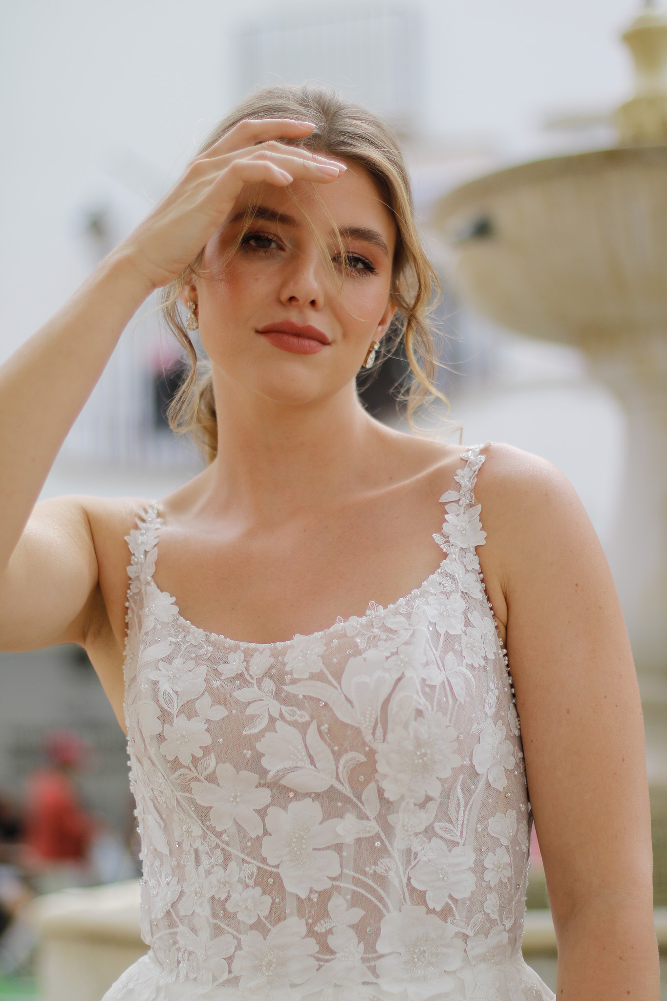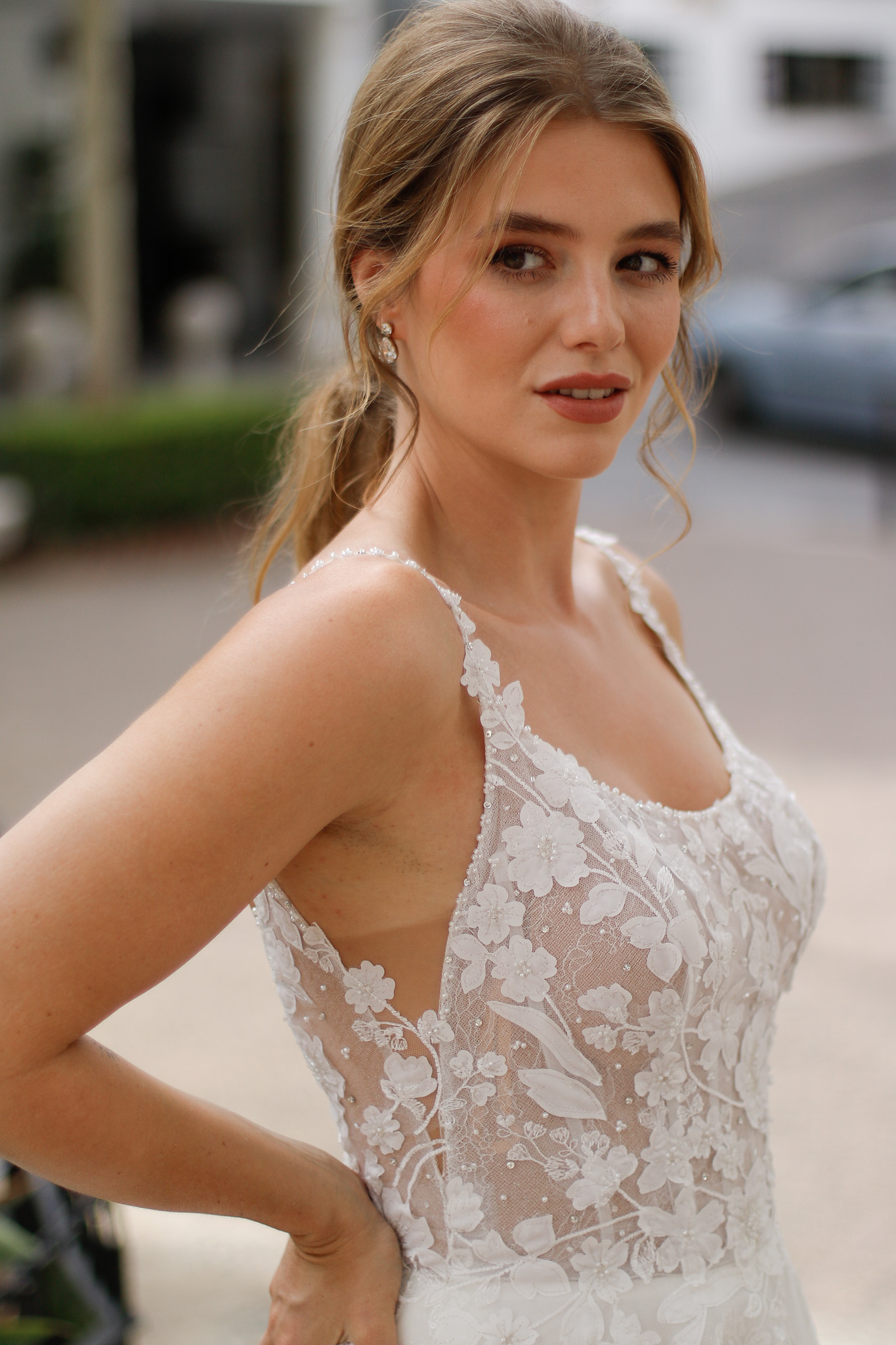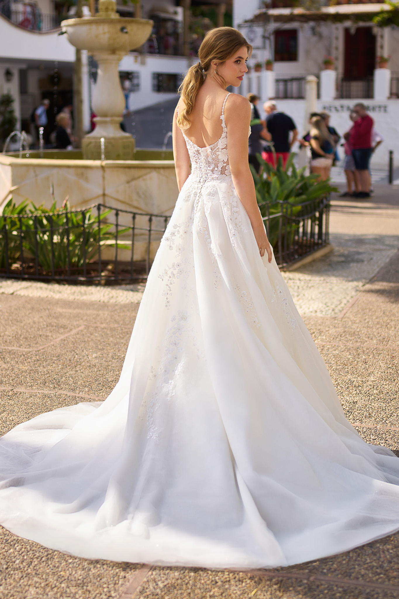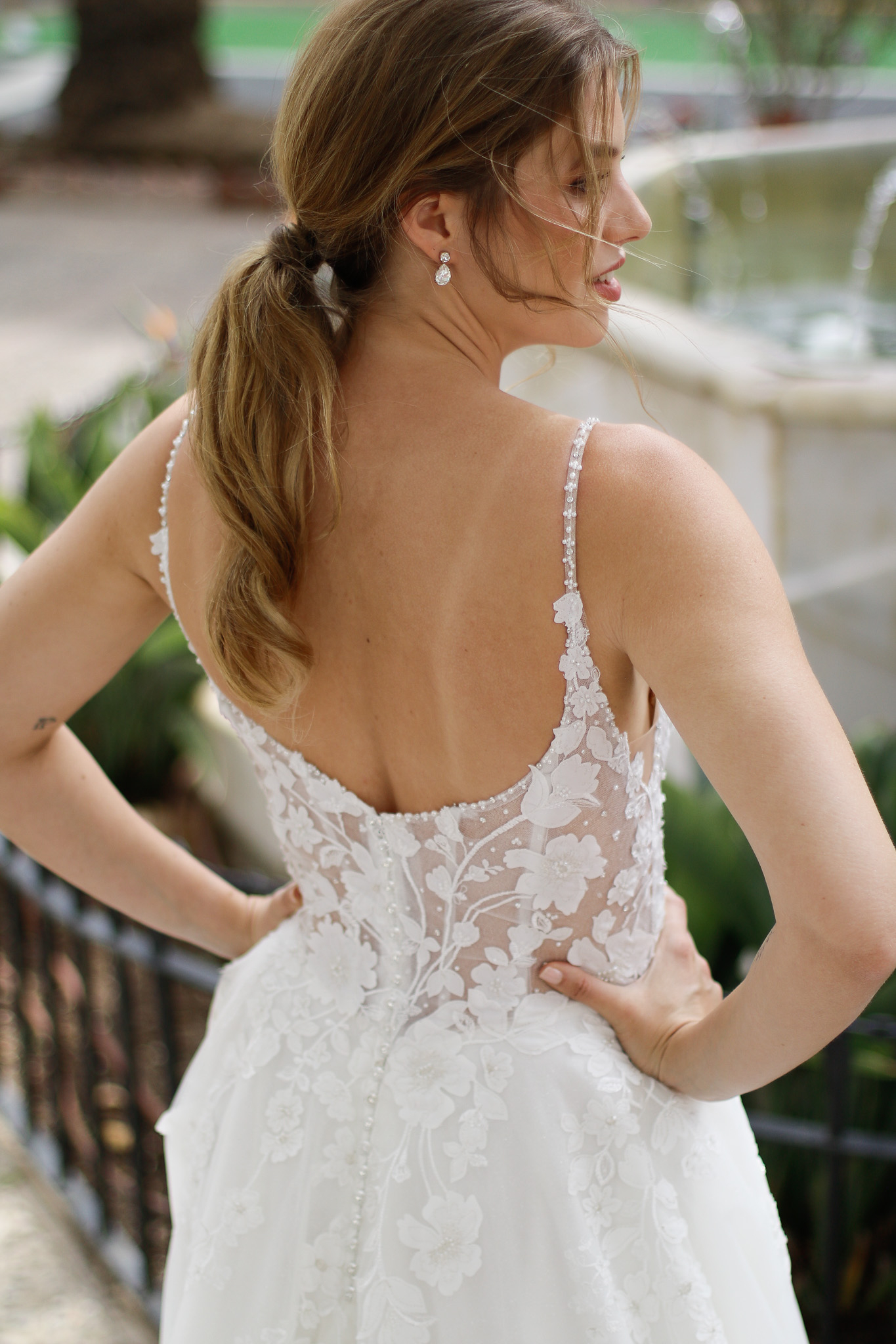 Dieses elegante und traditionelle Brautkleid in A-Linie ist mit einem modernen und stilvollen Rundhalsausschnitt gestaltet. Zarte Spitzenapplikationen zieren die Vorder- und Rückseite des Miederteils und formen die dunne Träger. Der Rock ist aus Lagen von (schimmerndem) Tüll über Satin gefertigt ist und einen modernen Schlitz beinhaltet.  Alle Materialdetails anzeigen