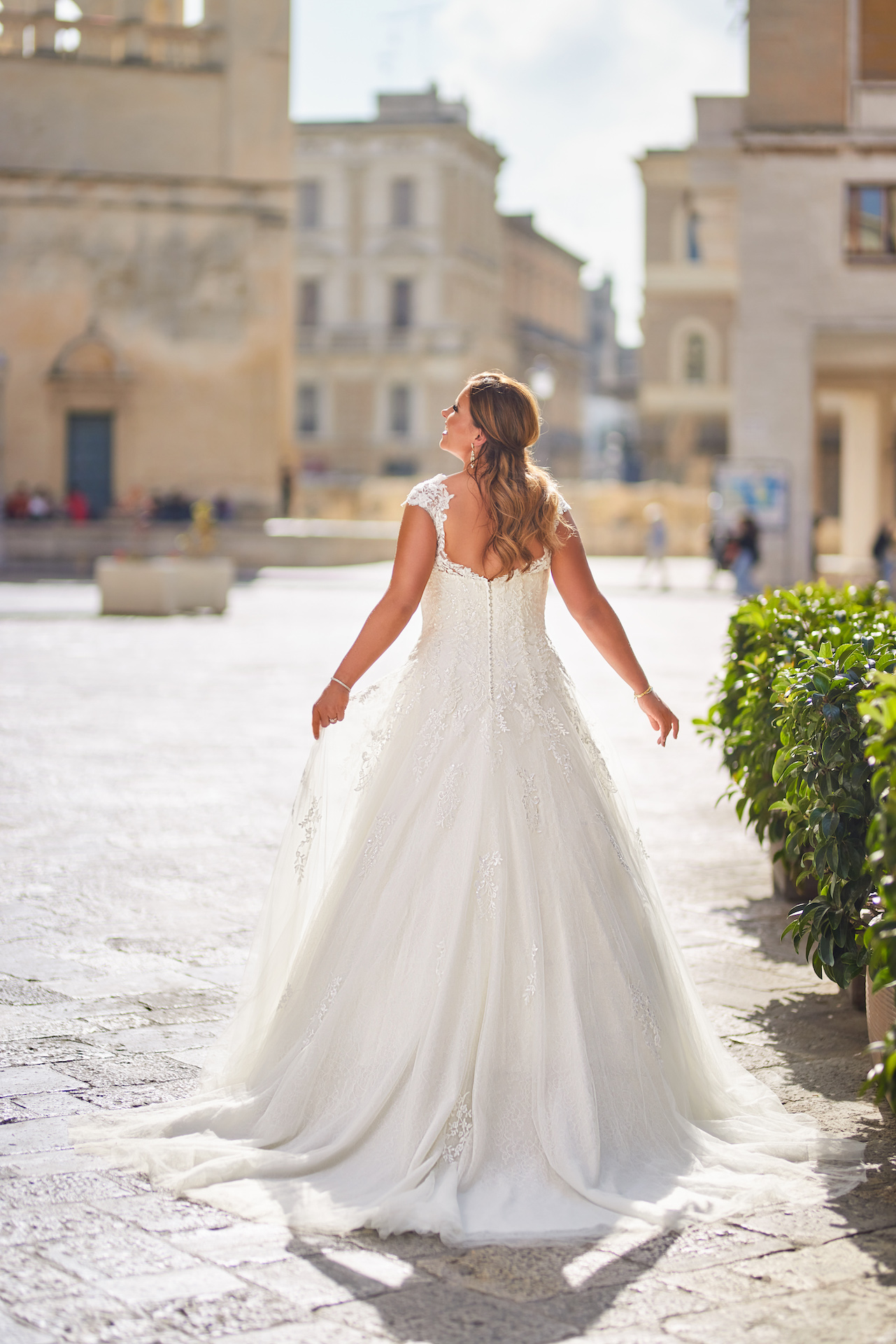 Deze vrouwelijke en elegante plus-size trouwjurk is ontworpen met prachtige kanten applicaties op een lijfje met een V-vormige halslijn en een elegante korset vetersluiting op de rug. Het lijfje heeft afneembare kapmouwtjes wat zorgt voor twee verschillende looks. De rok is gemaakt van meerdere lagen zacht vallende tule, satijn en versierd met kanten applicaties. Bekijk alle materiaal details