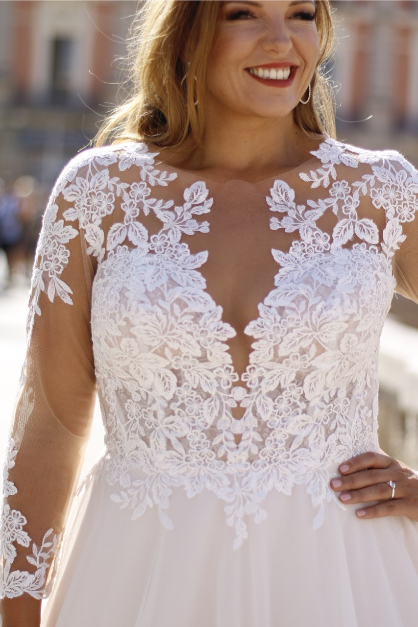 Deze traditionele en elegante plus size trouwjurk met een V-vormige halslijn, is ontworpen met delicate kanten applicaties die eindigen bij de taille. De jurk heeft transparante mouwen versierd met kanten details. De rok is gemaakt van meerdere lagen soepelvallende tule over satijn. Bekijk alle materiaal details