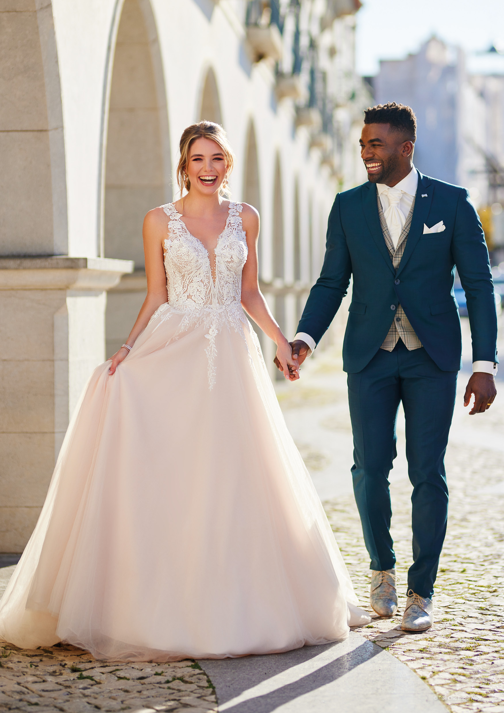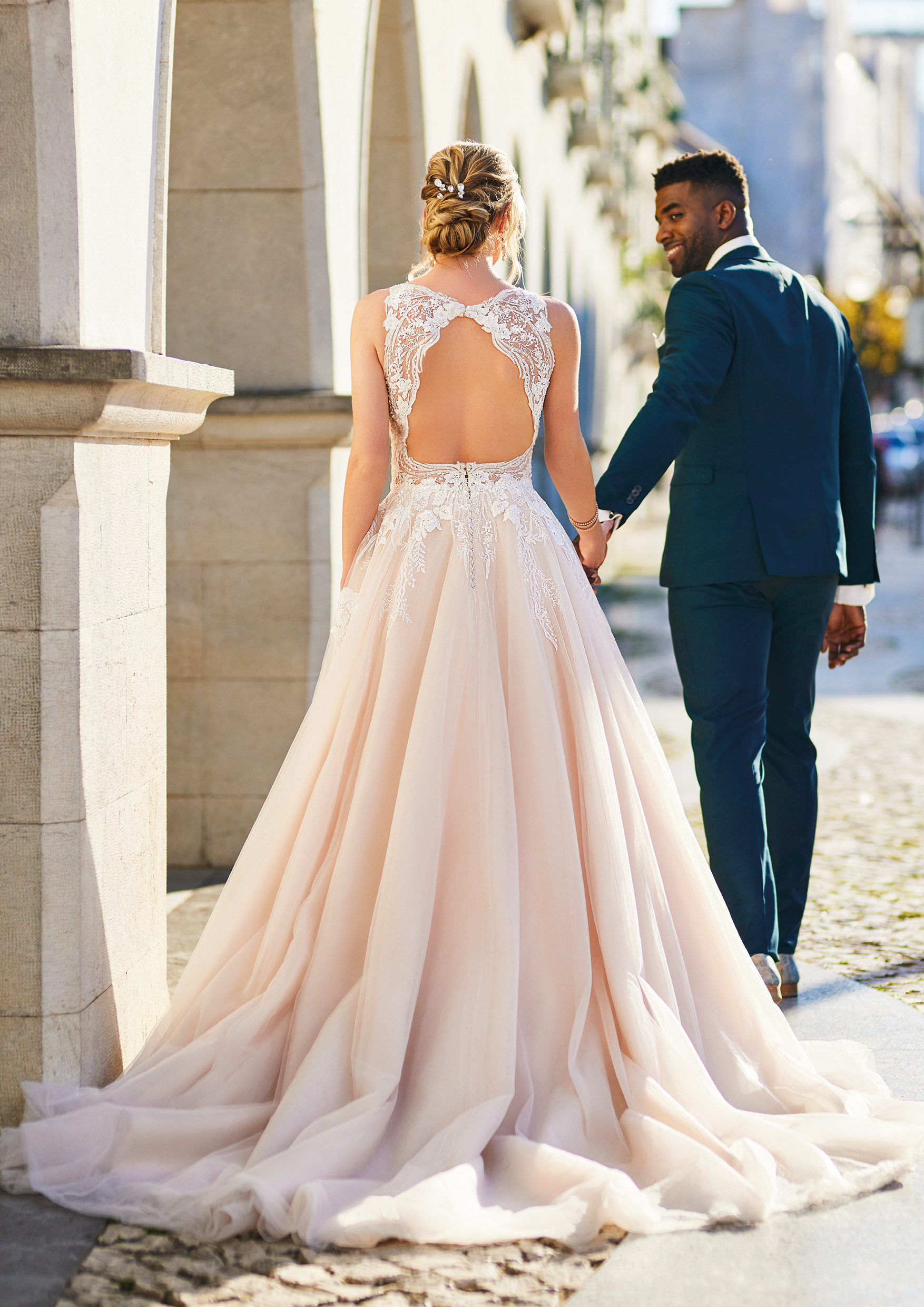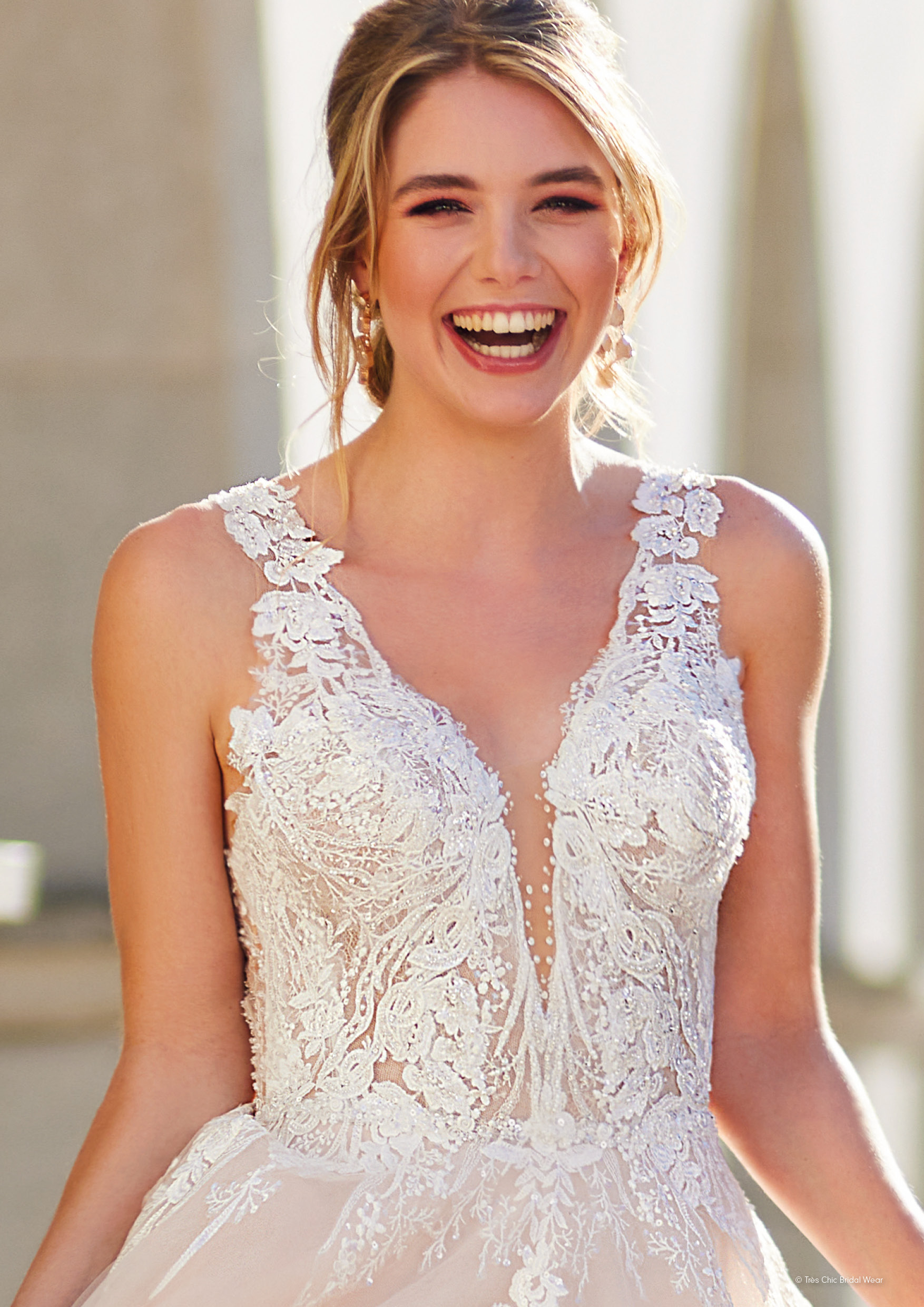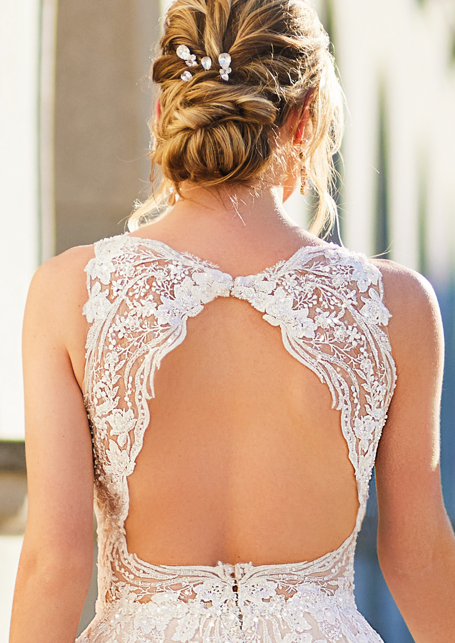 Modern en romantisch, deze champagne kleurige A-lijn en baljurk silhouet trouwjurk is rijkelijk gemaakt met volumineuze lagen tule voor de rok en de prachtige sleep. Het lijfje is subtiel afgewerkt met prachtige kanten applicaties over de V-vormige voorkant van het lijfje met kant op transparante panelen, en loopt als een waterval naar de achterkant van het lijfje om een spectaculair keyhole rug accent te vormen. Afgewerkt met delicate kralen en pailletten. Ook verkrijgbaar in ivoor. Bekijk alle materiaal details