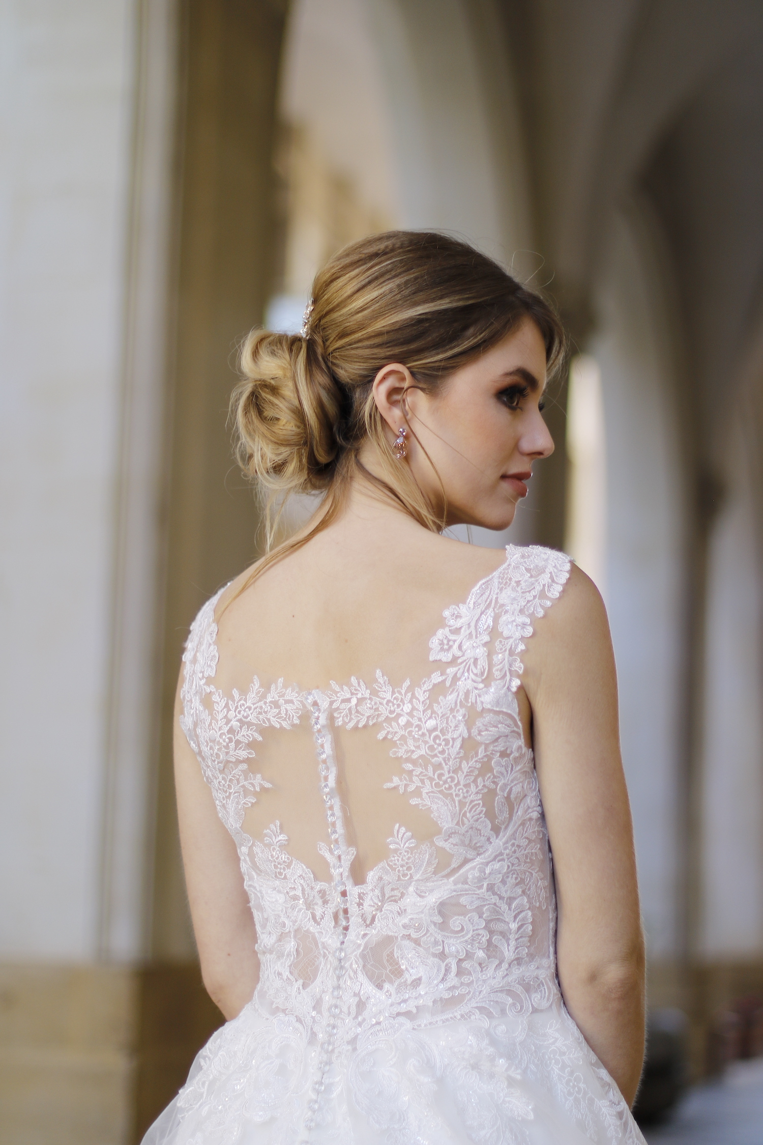 Elegant en delicaat kant bedekt het lijfje van deze trouwjurk is n traditionele stijl en valt subtiel over de taille. Het heeft ook een prachtig keyhole rug-accent en elegante bandjes. De rok is gemaakt van meerdere lagen tule en satijn. Bekijk alle materiaal details