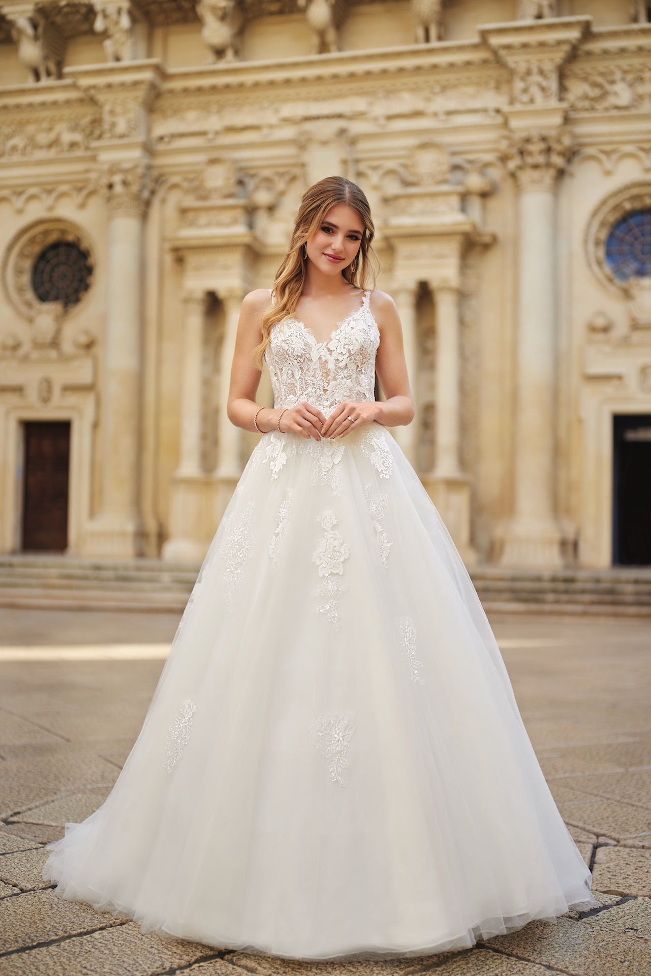 Deze elegante en traditionele trouwjurk in A-lijn stijl heeft delicate en prachtige kanten applicaties op een semi-transparant korset stijl lijfje. De achterkant is ontworpen met kanten panelen en de rok is gemaakt met lagen tule en satijn. Bekijk alle materiaal details