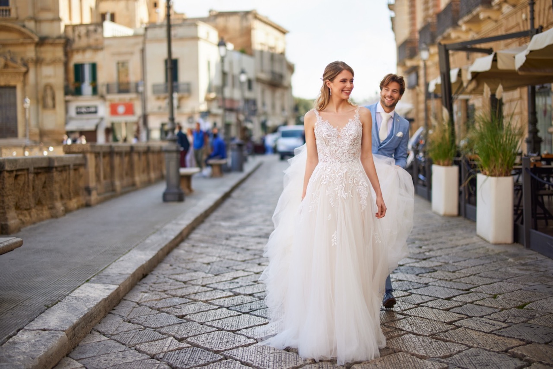 Prachtig en elegant, deze trouwjurk in traditionele stijl is ontworpen met een semi-transparant lijfje versierd met meerdere lagen delicate kanten applicaties die over de taille lopen. De rok is gemaakt van meerdere lagen soepelvallende tule, organza en satijn. Bekijk alle materiaal details