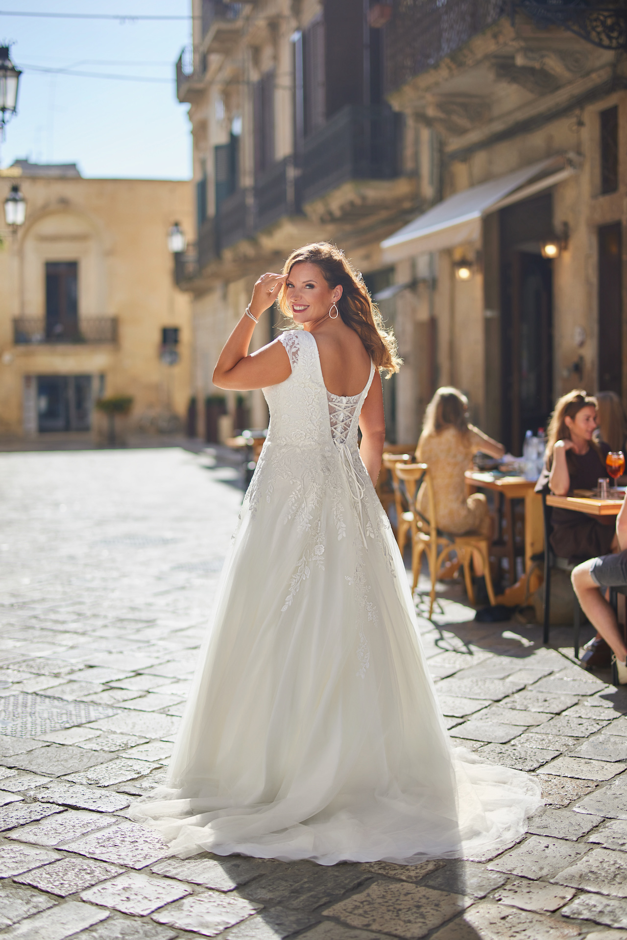 Luxurious and traditional, this plus-size wedding dress is designed with magnificent lace appliqués on a bateau-shaped bodice and an elegant corset lace-up back. The skirt is created with multiple layers of soft-flowing tulle over stretch satin. See all material details