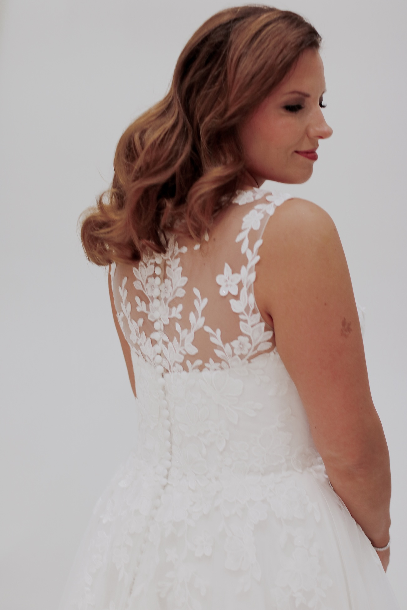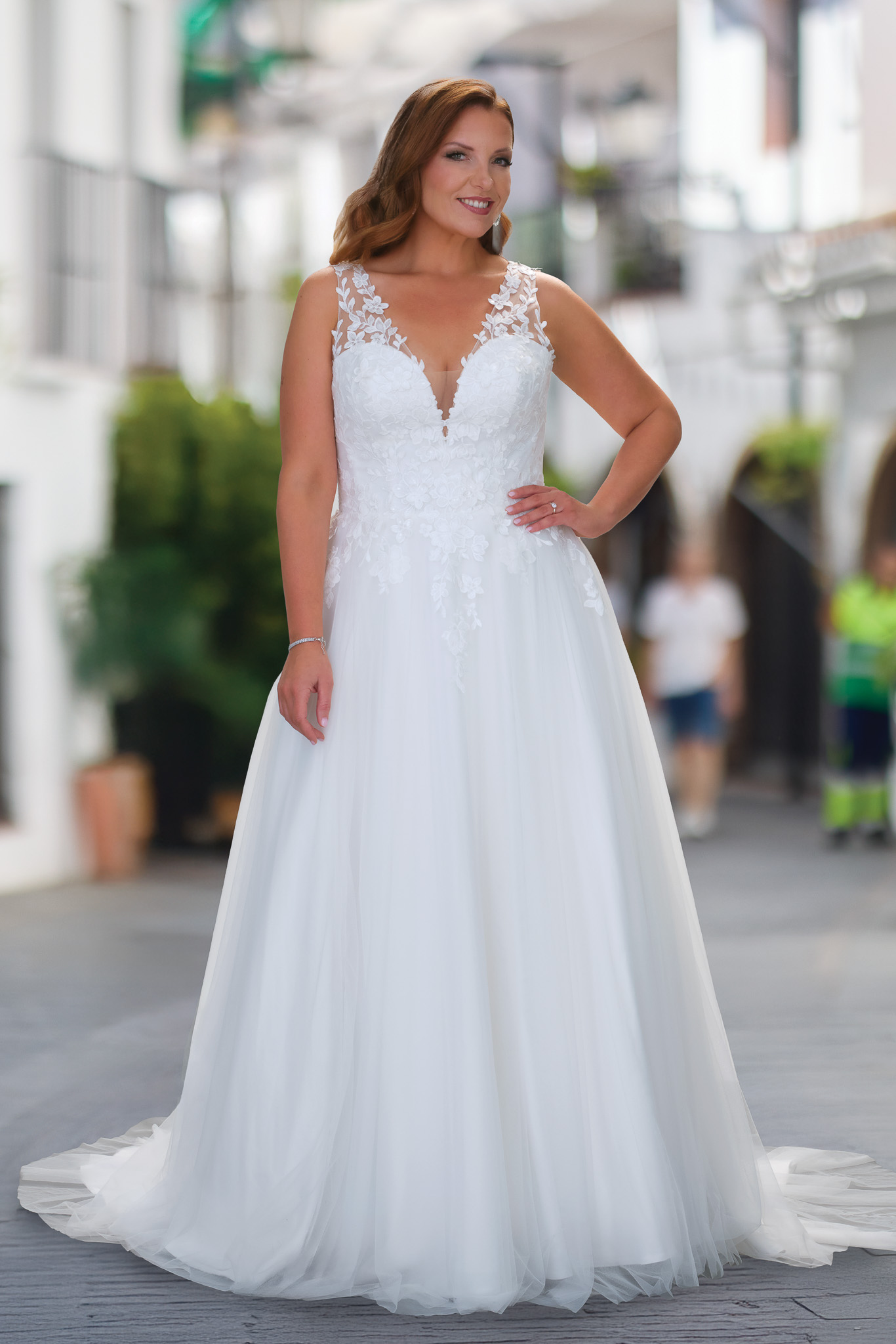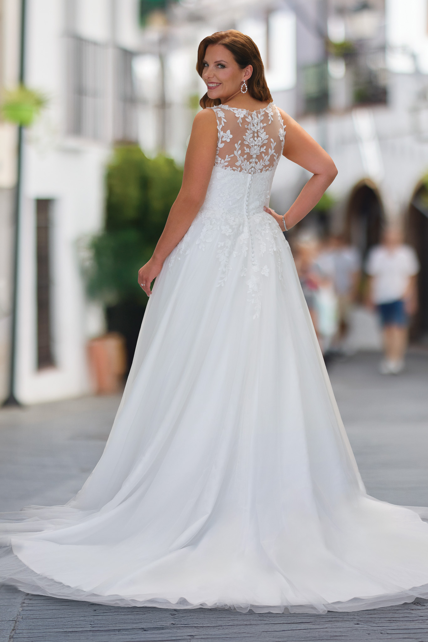 Exquisite and traditional, this plus-size wedding dress in A-line style is designed with a transparant panel with lace appliqués over a sweetheart neckline. The lace appliqués cascade just past the waistline of the skirt. The skirt is beautifully crafted in layers of tulle over satin. See all material details