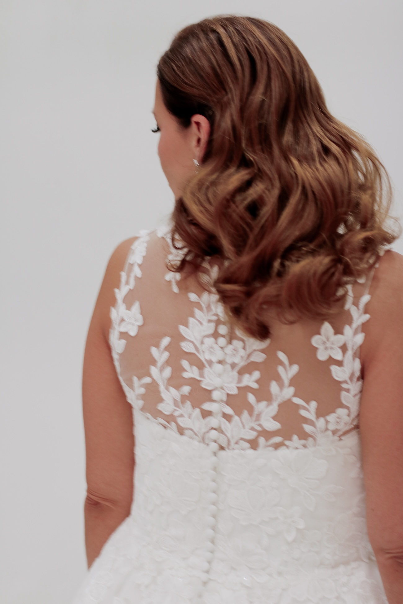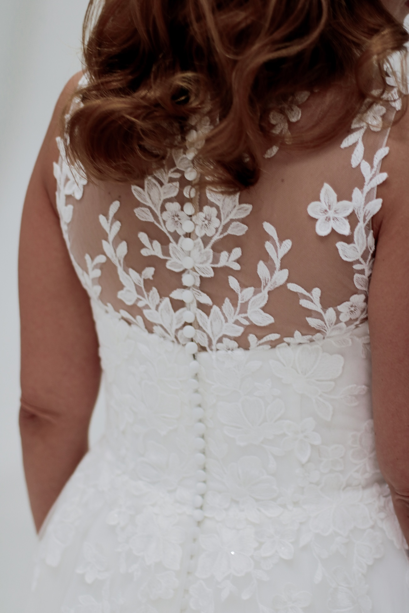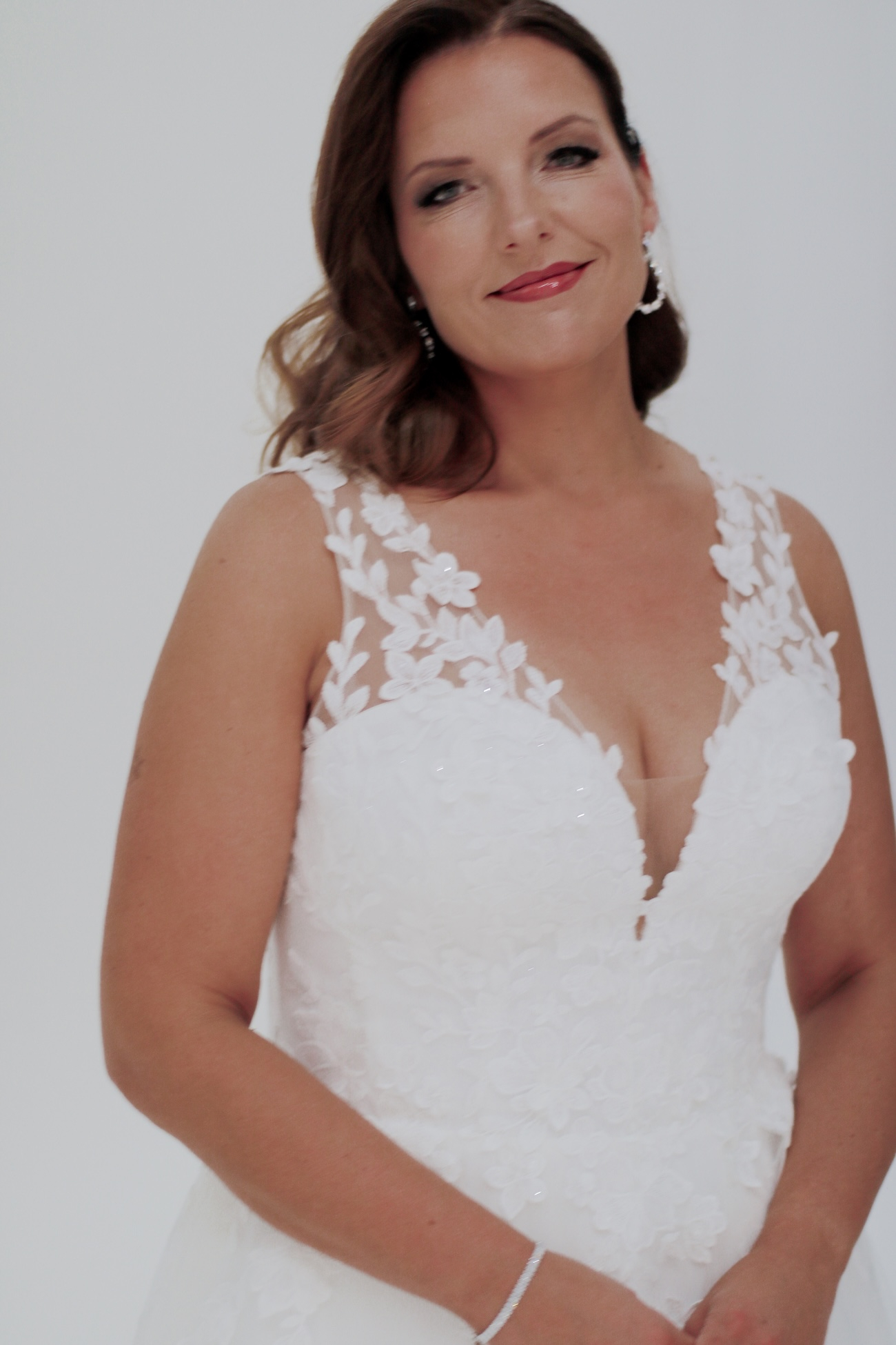 Exquisite and traditional, this plus-size wedding dress in A-line style is designed with a transparant panel with lace appliqués over a sweetheart neckline. The lace appliqués cascade just past the waistline of the skirt. The skirt is beautifully crafted in layers of tulle over satin. See all material details
