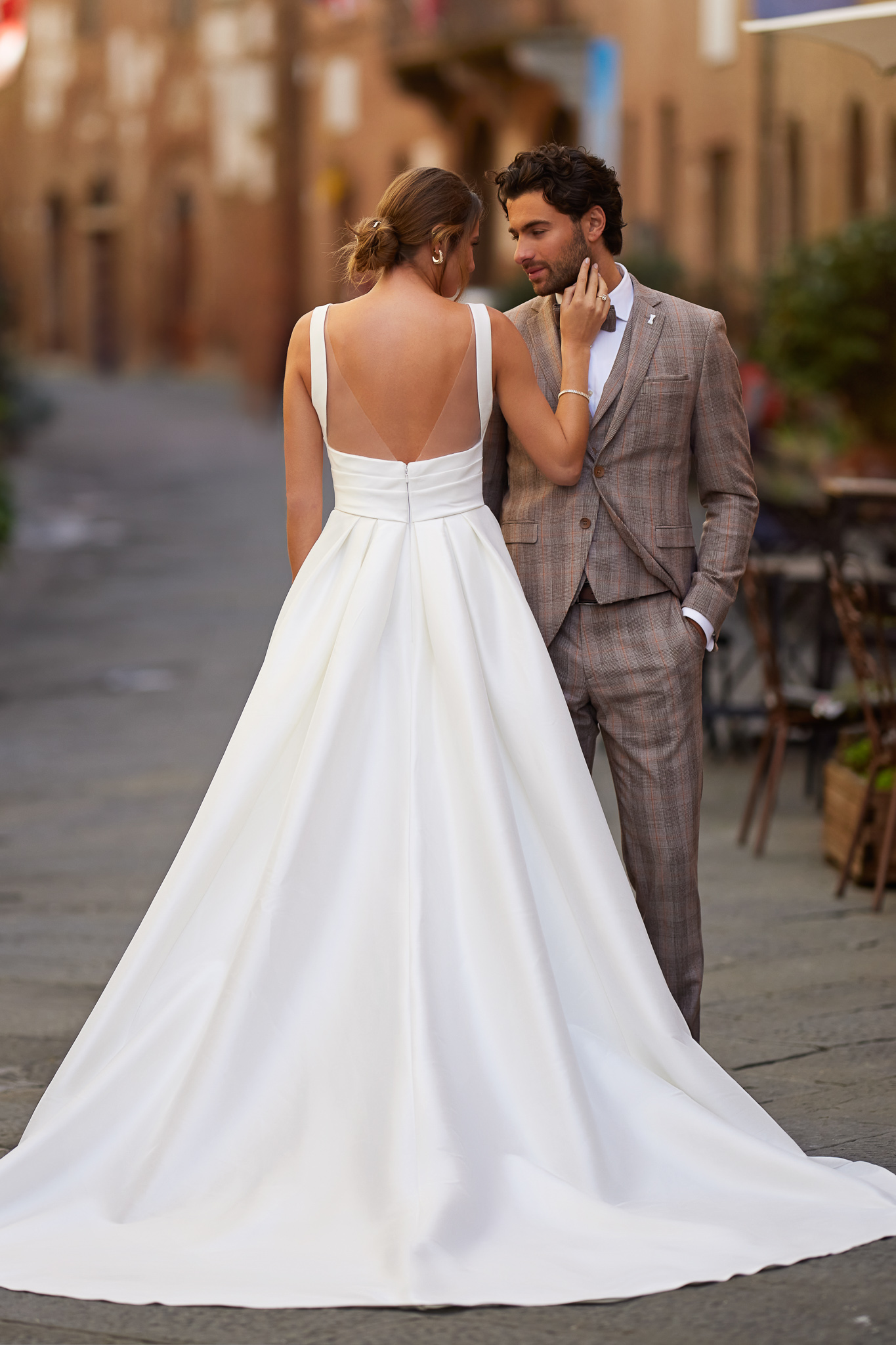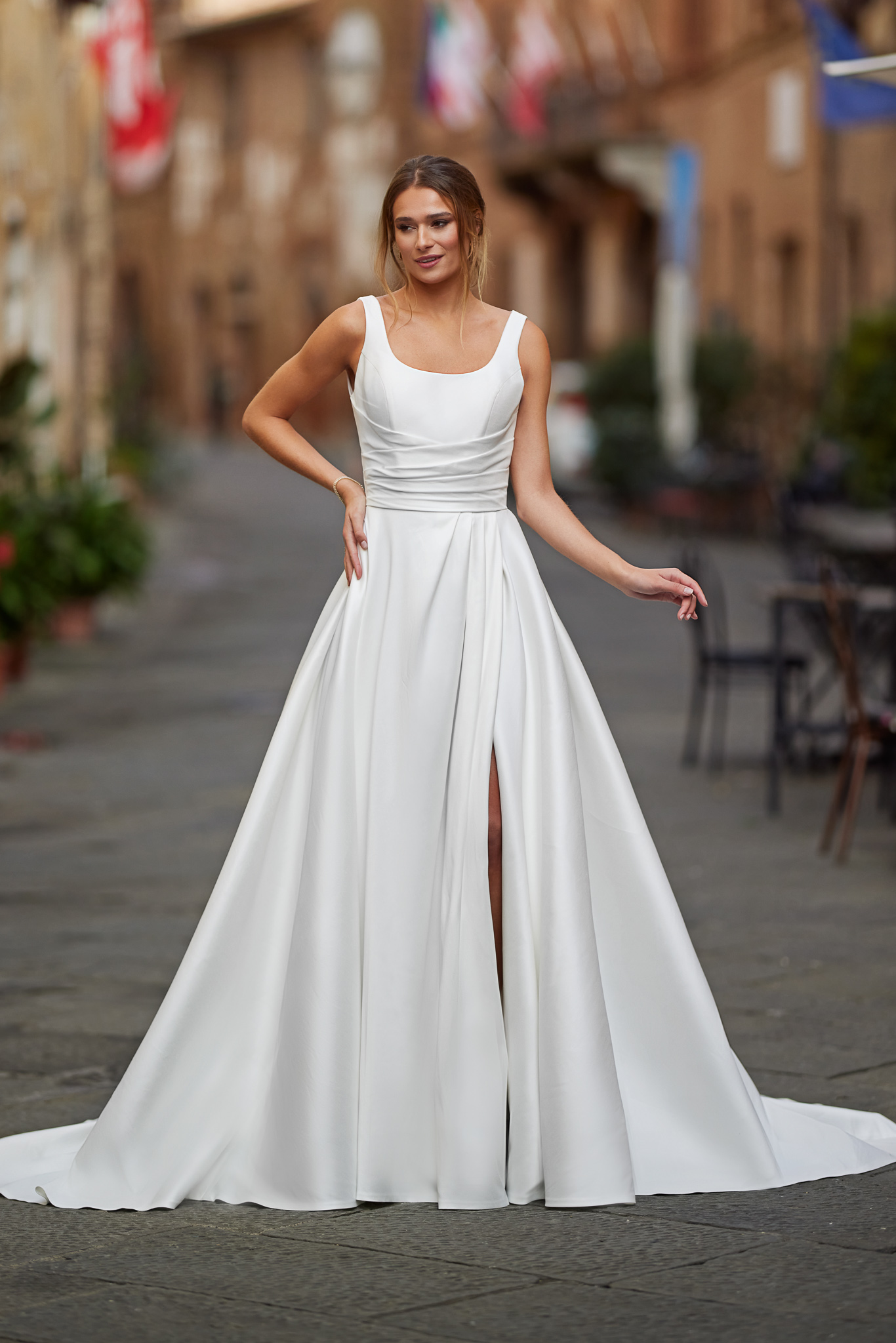 Elegant and modern, this all Mikado A-line/ball gown style wedding dress is designed with a scoop neckline and a beautifully draped waist that gracefully transitions into a gorgeous layering skirt with a delicate train. The square back has elegant transparant panels to create a interesting back accent. Finally, the Skirt includes hidden pockets in the side seams and a modern slit. See all material details