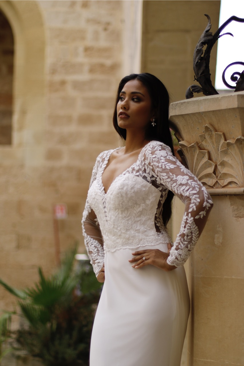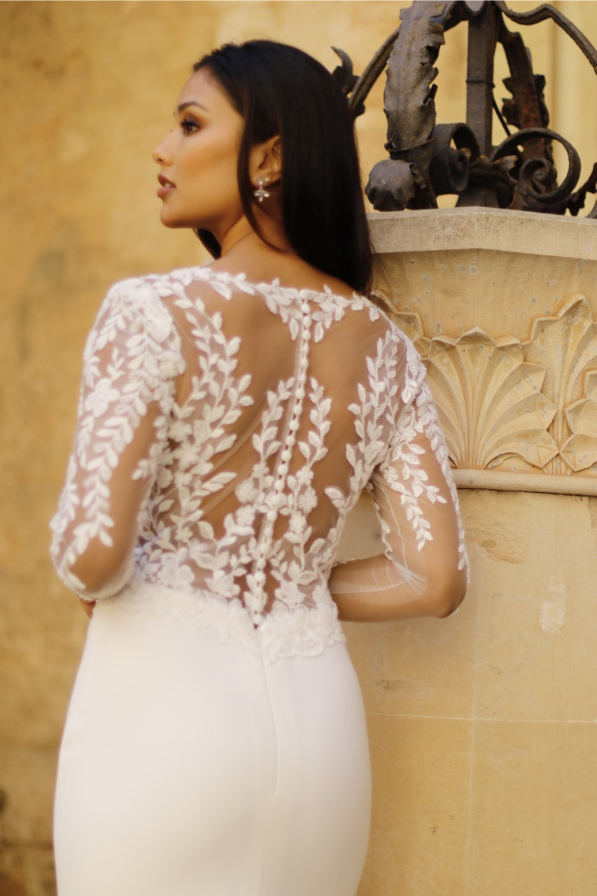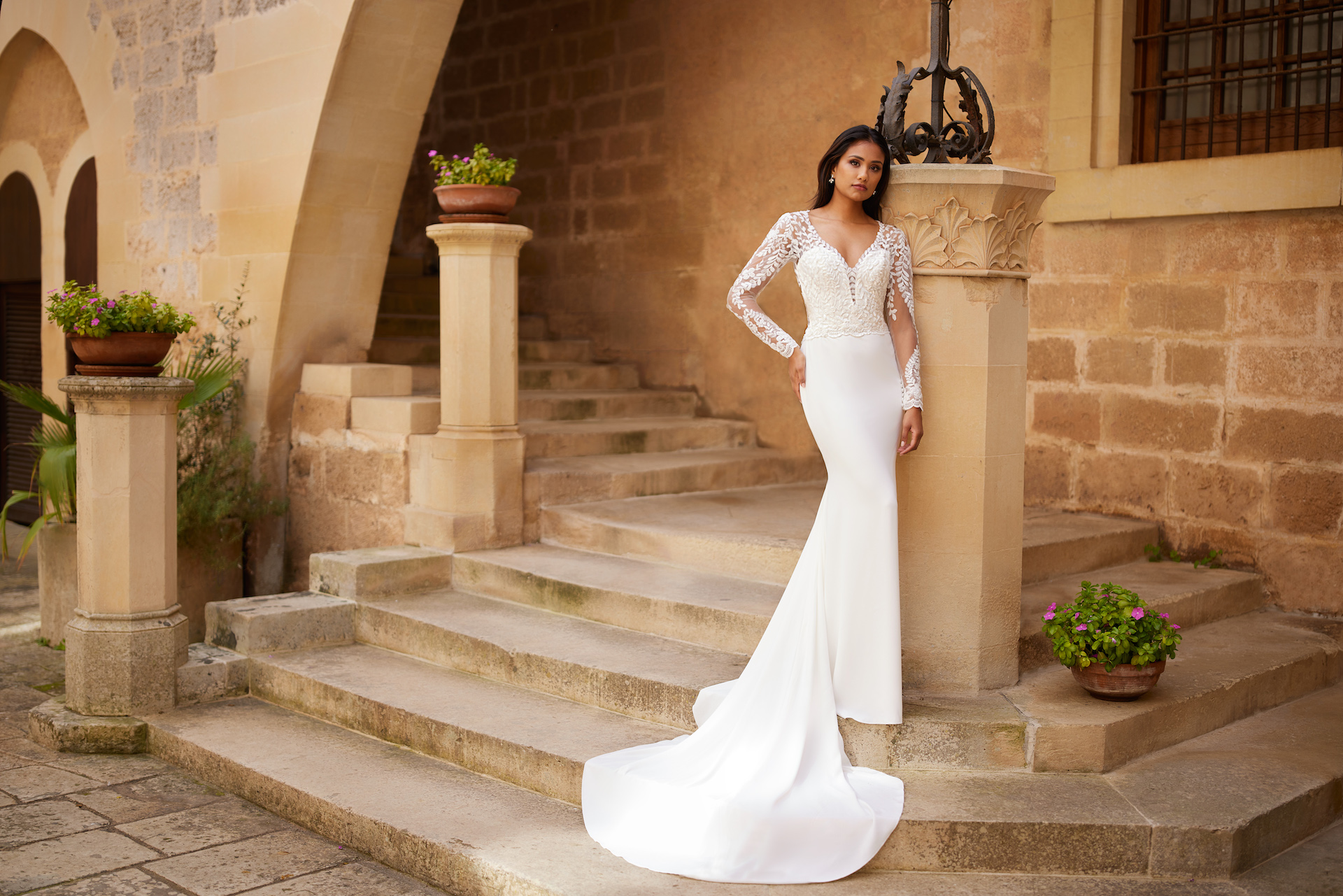 Elegant and sophisticated, this mermaid-style wedding dress is created from luxurious crepe georgette, and designed with the bodice adorned with elegant contemporary lace appliqués that continue to form the full-length sleeves over sheer net.