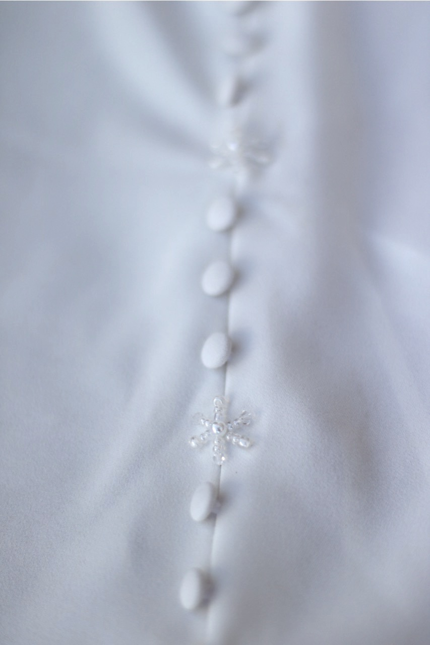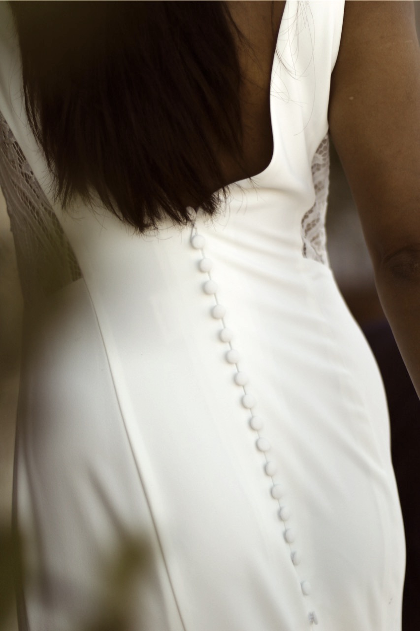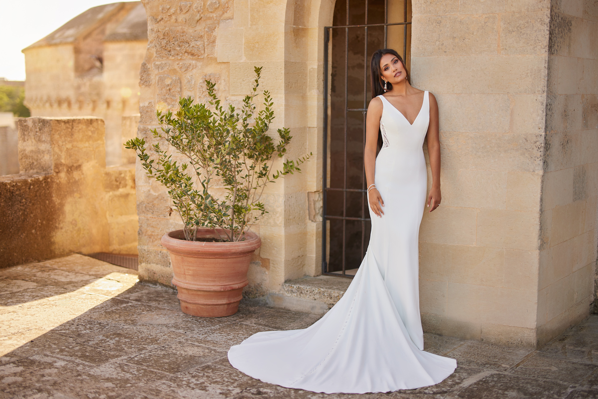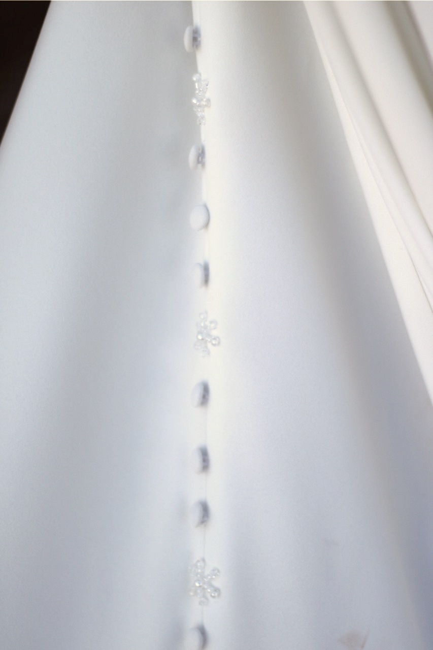 This all crepe georgette mermaid-style wedding dress epitomizes elegance and sophistication featuring a beautiful V-shape neckline and delicate lace side panels in the bodice. The skirt also features chic fabric buttons that cascade from the waist to the end of the train for a dramatic look.