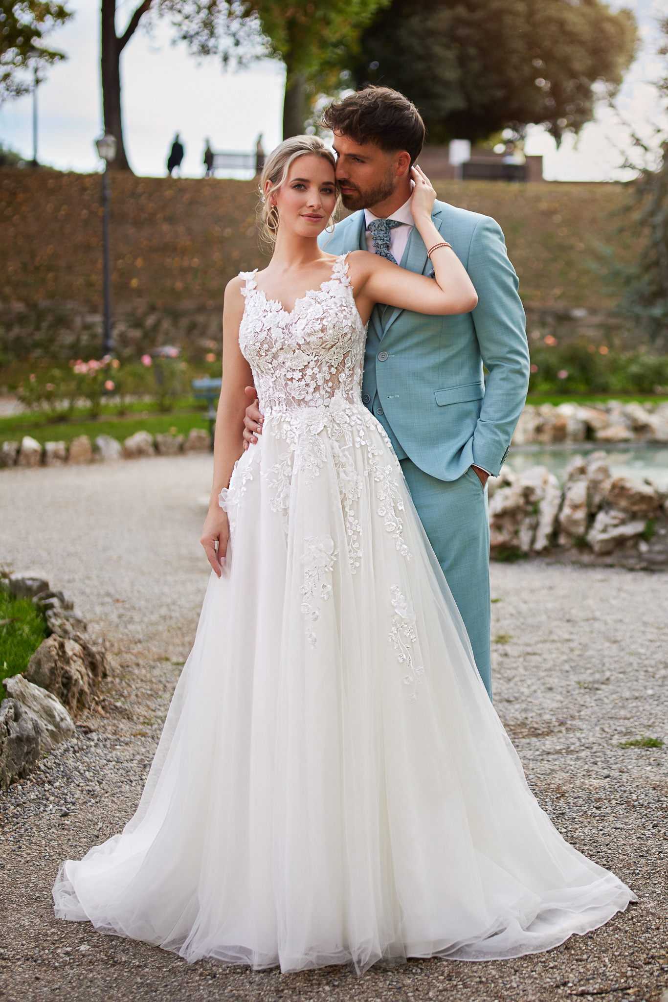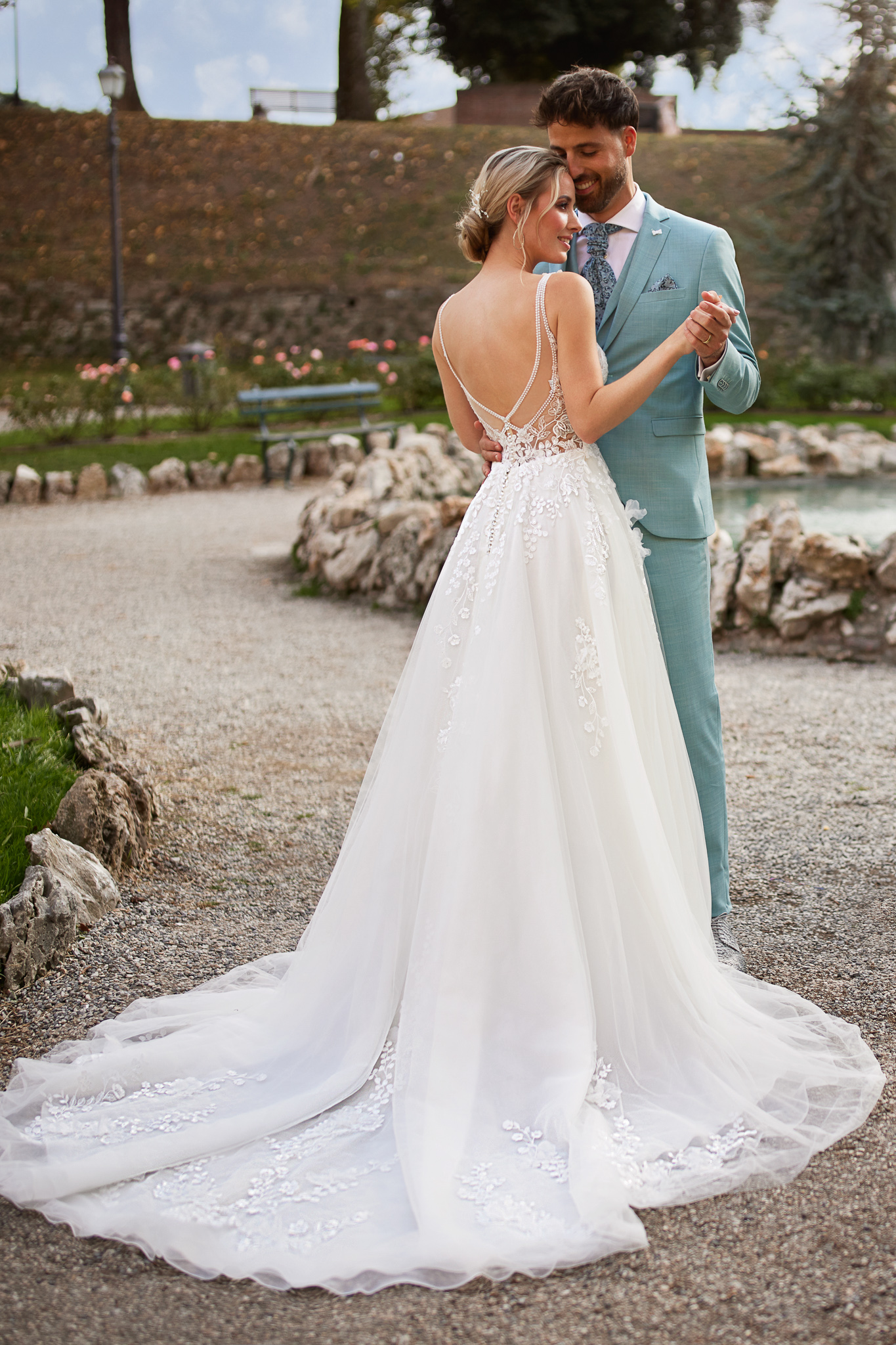 Breathtaking and traditional, this wedding dress features stunning lace appliqués on the bodices that cascade down the skirt. The back features a special design with delicate lace lining over a sheer tulle. The skirt is created with multiple layers of tulle over satin. See all material details