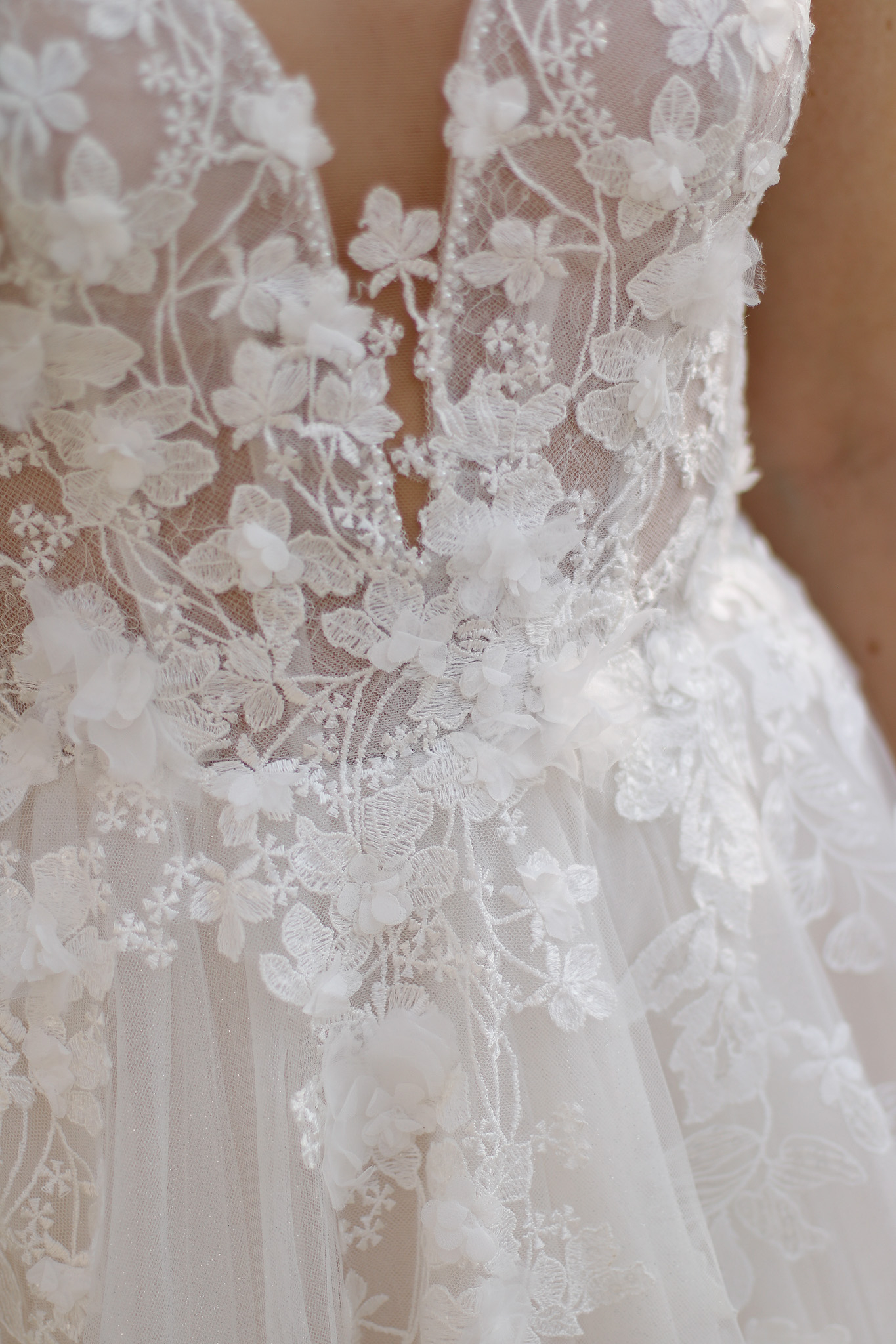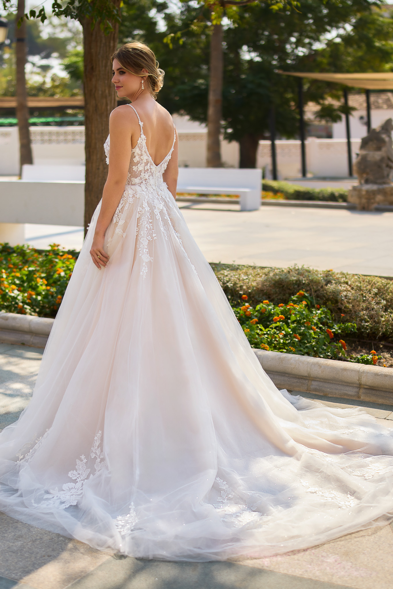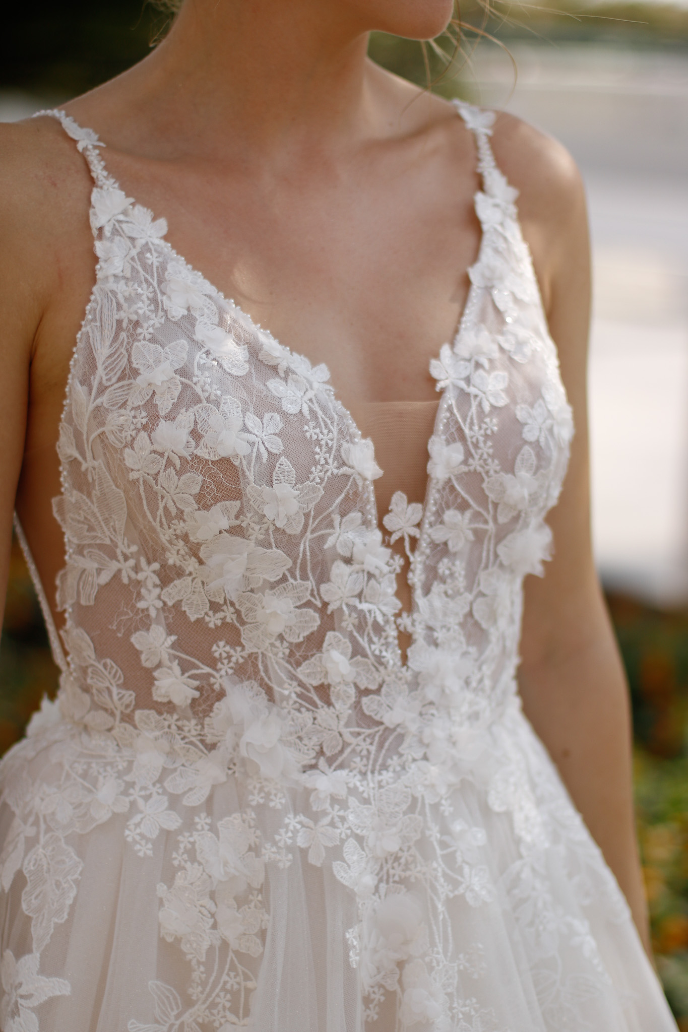 Elegant and traditional, this A-line wedding dress is designed with layers of delicate lace appliqués over a layer of lace in the bodice. The front has a deep-V neckline with complimentary V-shapes on the sides and the back. The lace appliqués cascade down along the skirt, which is created from (glitter) layers of tulle over satin. See all material details