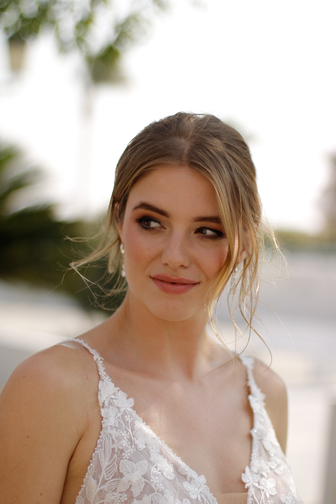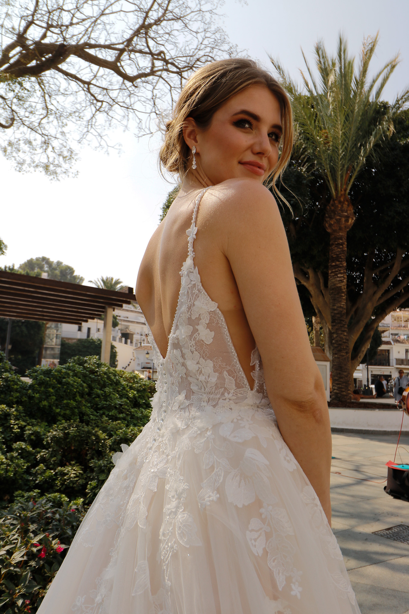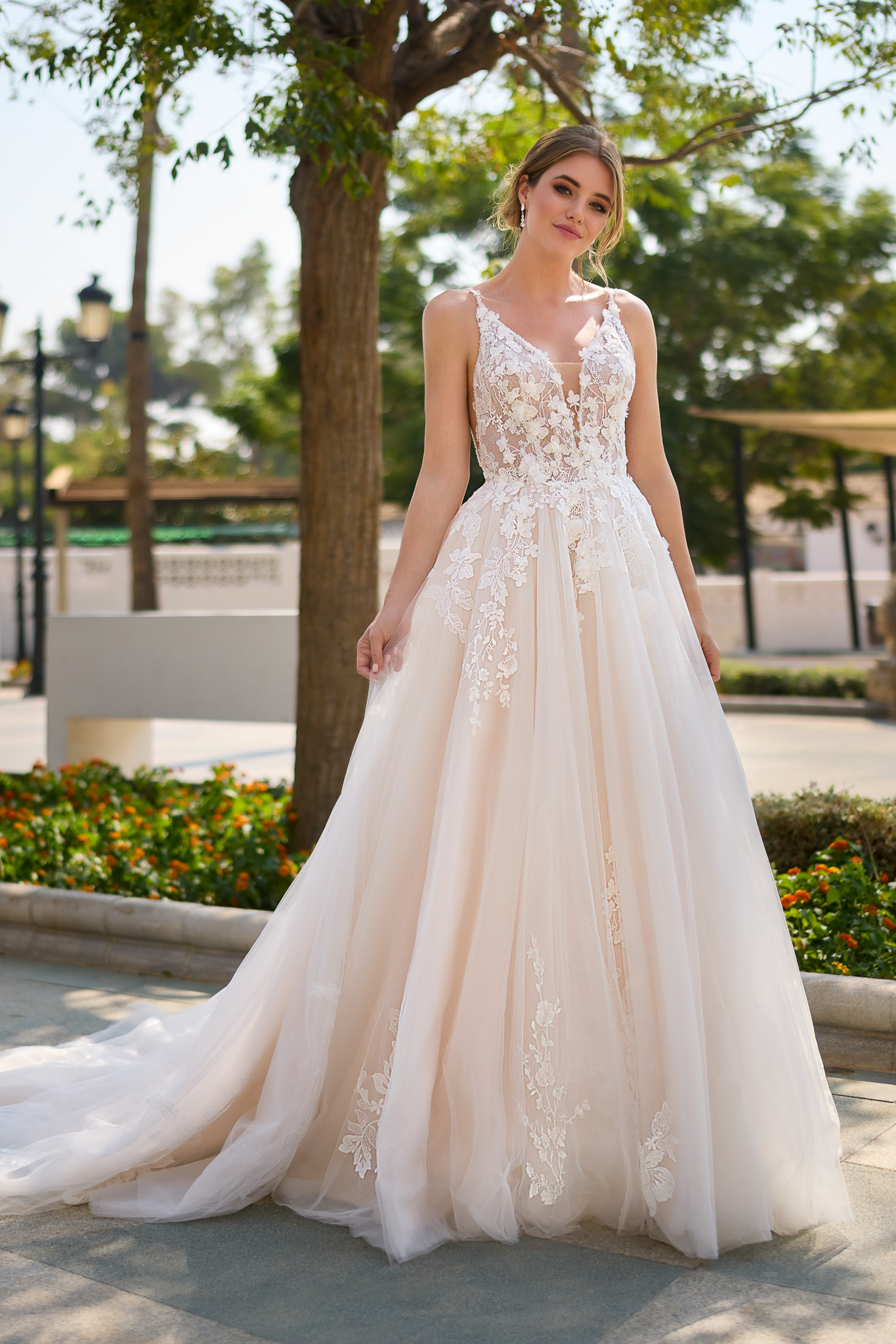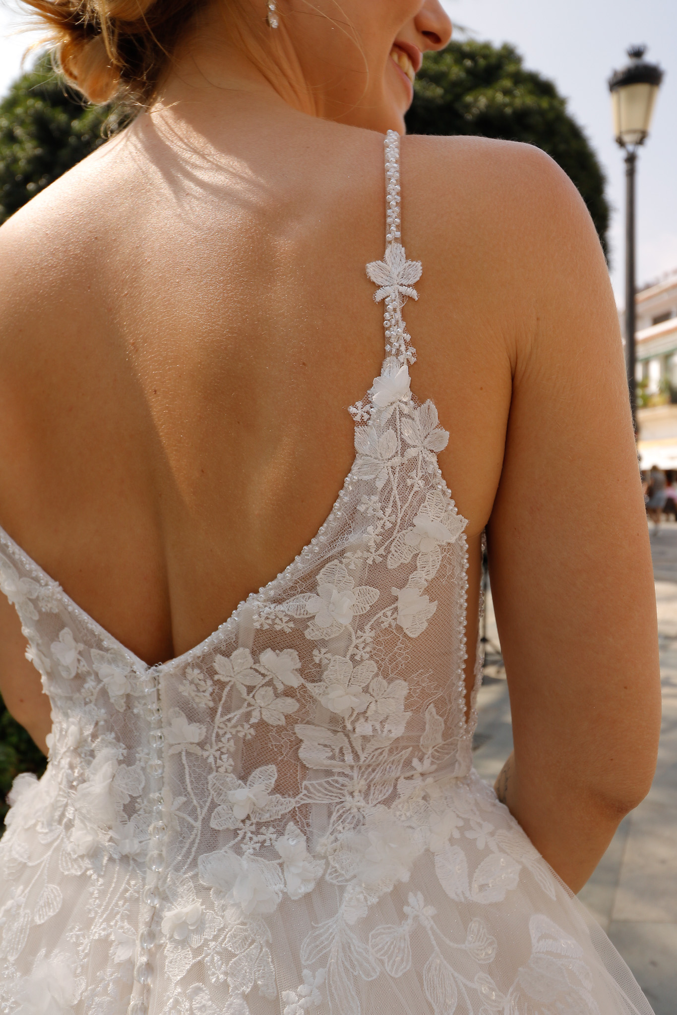 Elegant and traditional, this A-line wedding dress is designed with layers of delicate lace appliqués over a layer of lace in the bodice. The front has a deep-V neckline with complimentary V-shapes on the sides and the back. The lace appliqués cascade down along the skirt, which is created from (glitter) layers of tulle over satin. See all material details