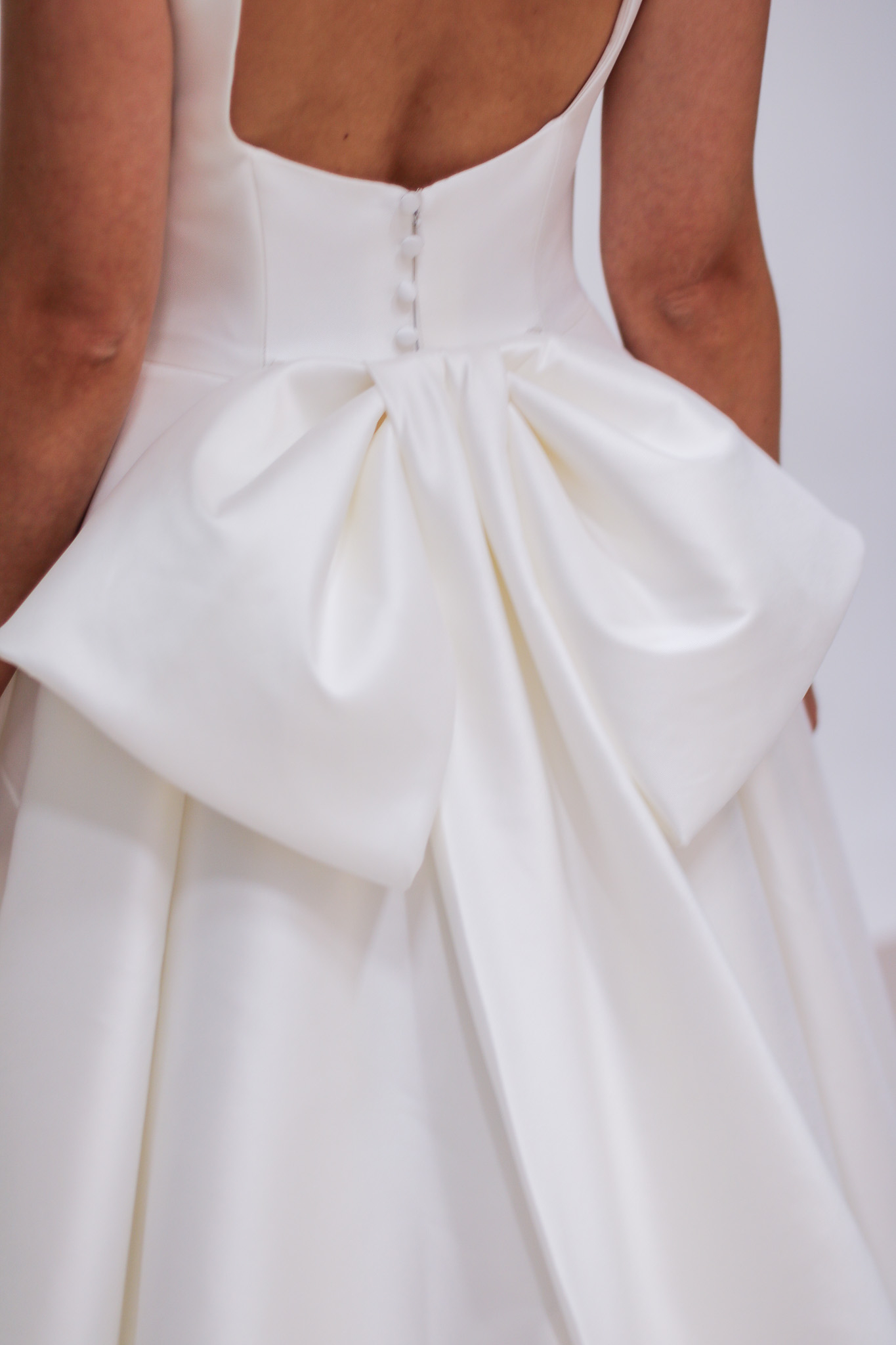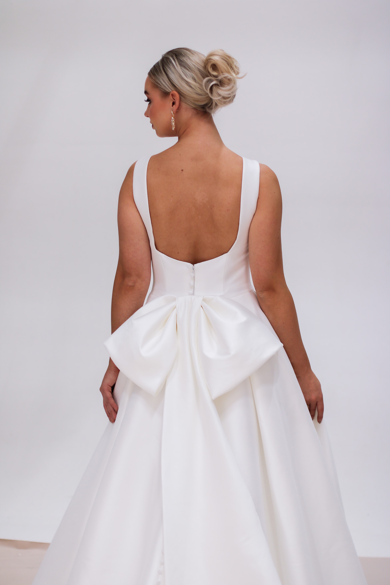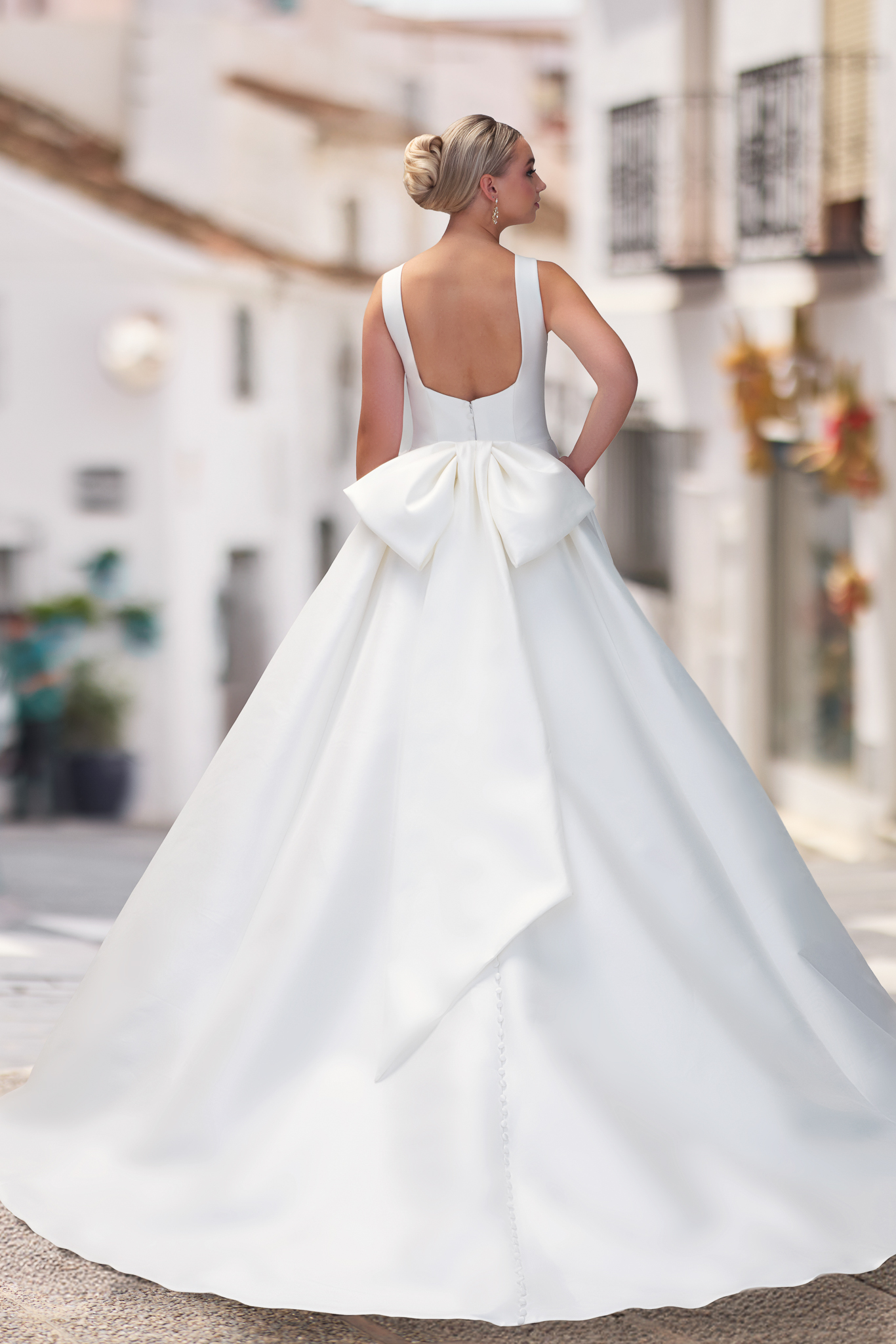 Elegant and modern, this all Mikado A-line/ball gown style wedding dress is designed with a boat neck that gracefully transitions into a gorgeous layering skirt with a delicate train. The square back has a beautifully crafted bow in the back to create a interesting back accent. Finally, the skirt features chic fabric buttons that cascade from the waist to the end of the train for a dramatic look. See all material details