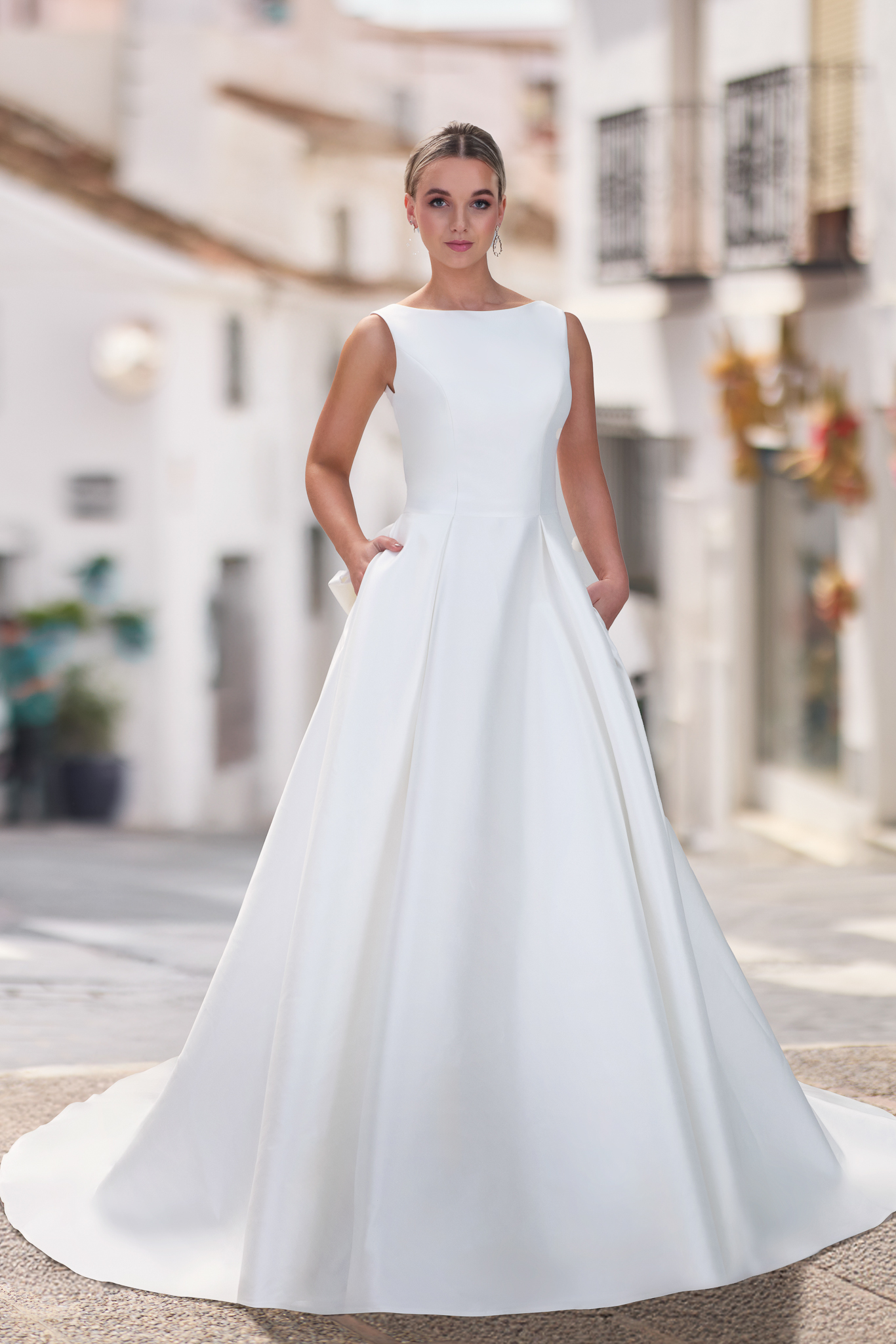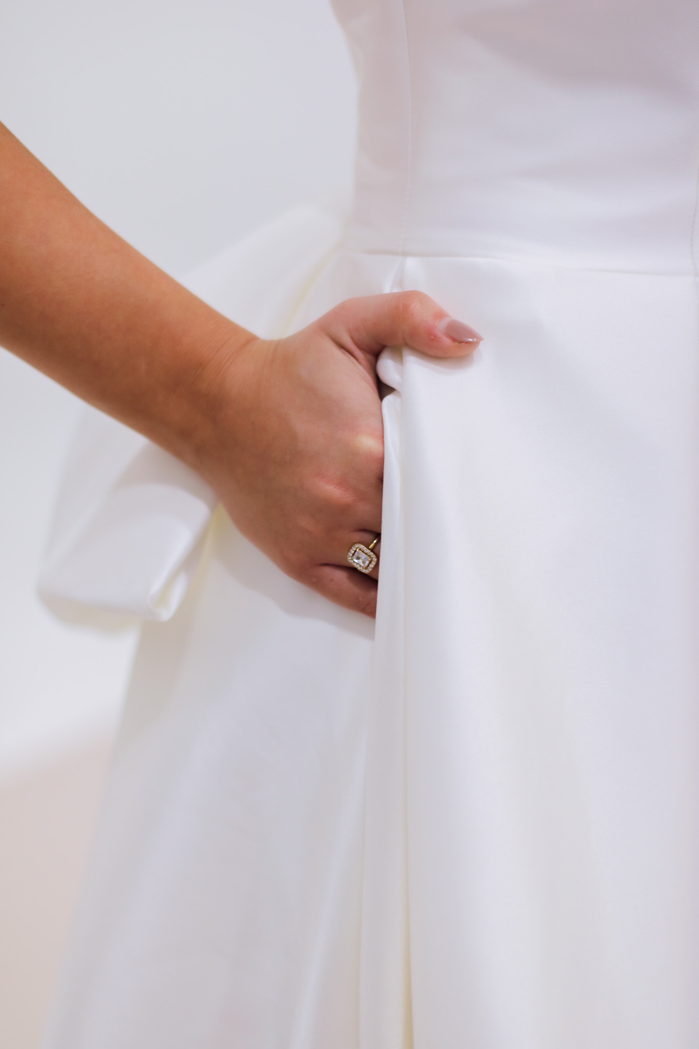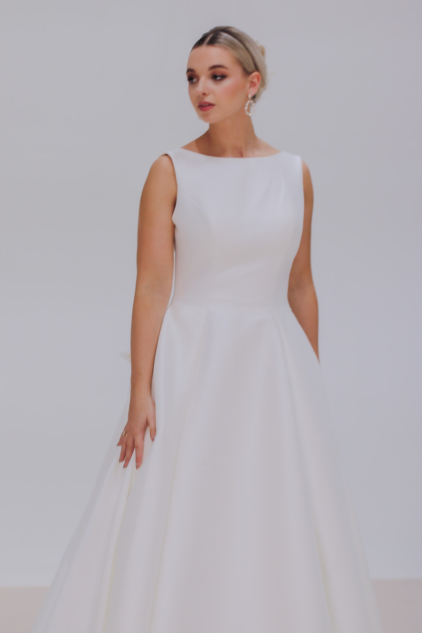 Elegant and modern, this all Mikado A-line/ball gown style wedding dress is designed with a boat neck that gracefully transitions into a gorgeous layering skirt with a delicate train. The square back has a beautifully crafted bow in the back to create a interesting back accent. Finally, the skirt features chic fabric buttons that cascade from the waist to the end of the train for a dramatic look. See all material details