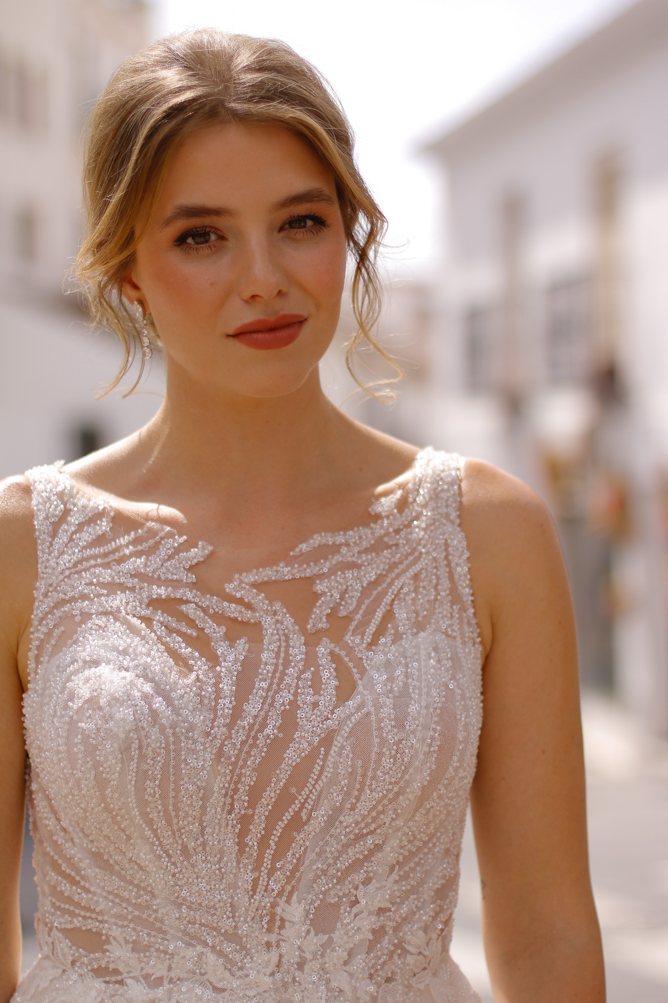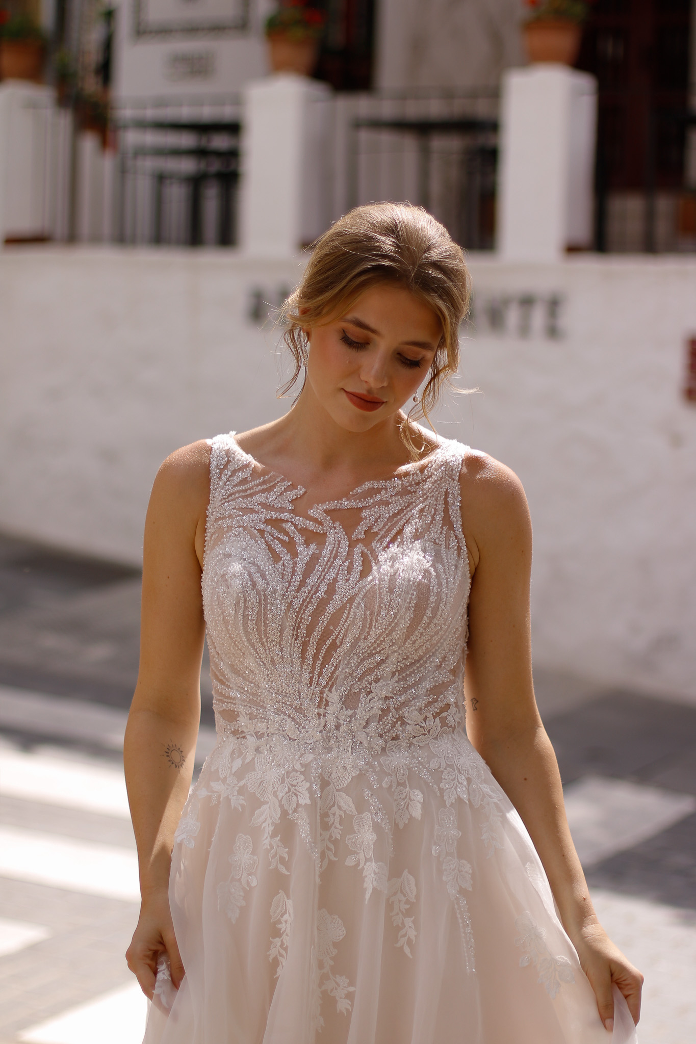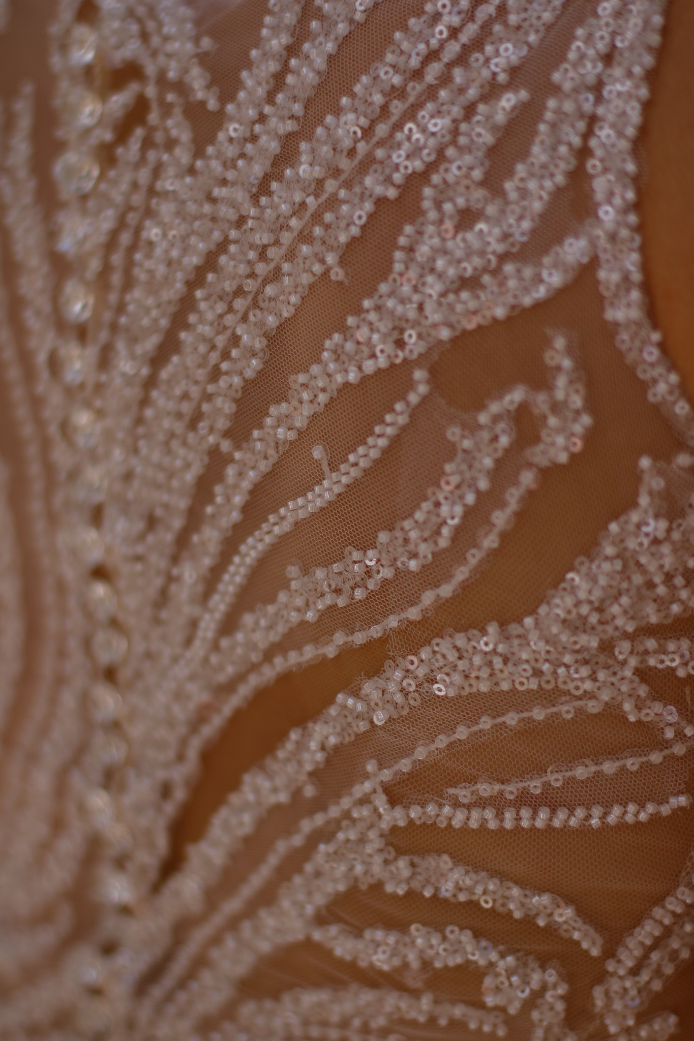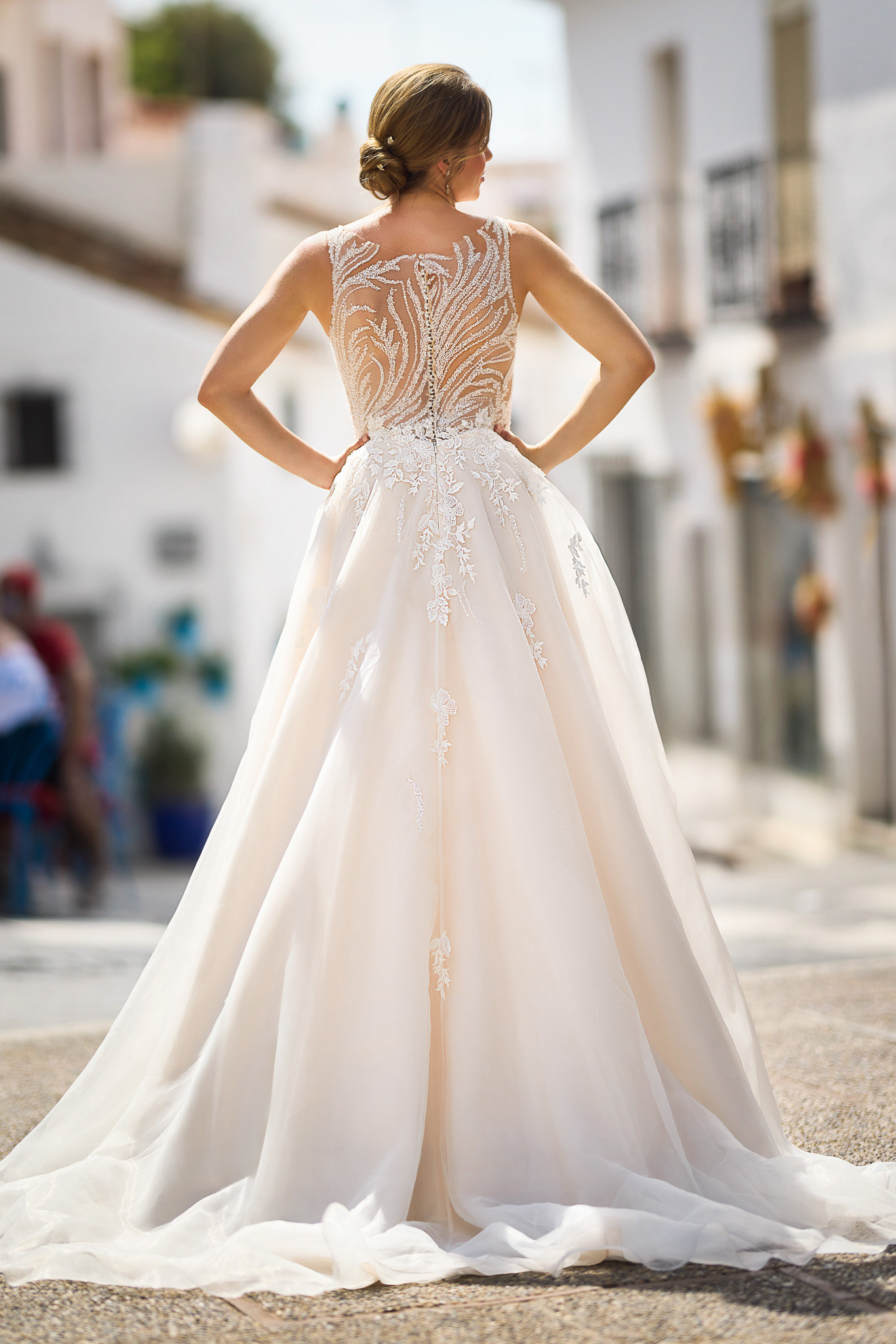 Gorgeous layers of organza fabric create this elegant champagne colored A-line wedding dress. The bodice has a high neckline created with a pattern of beading and sequins on a nude tulle panel, that also creates the amazing back detail. The dress is finished with a romantic flowing train. See all material details