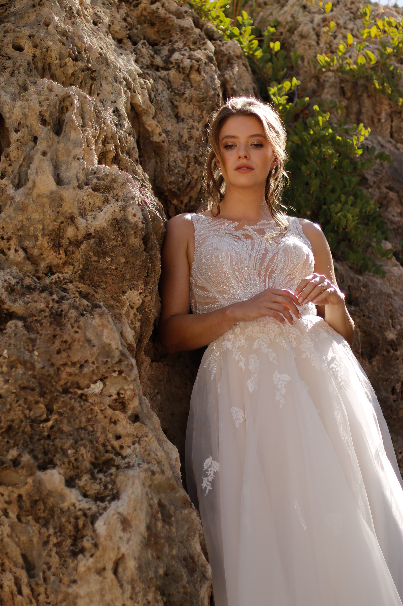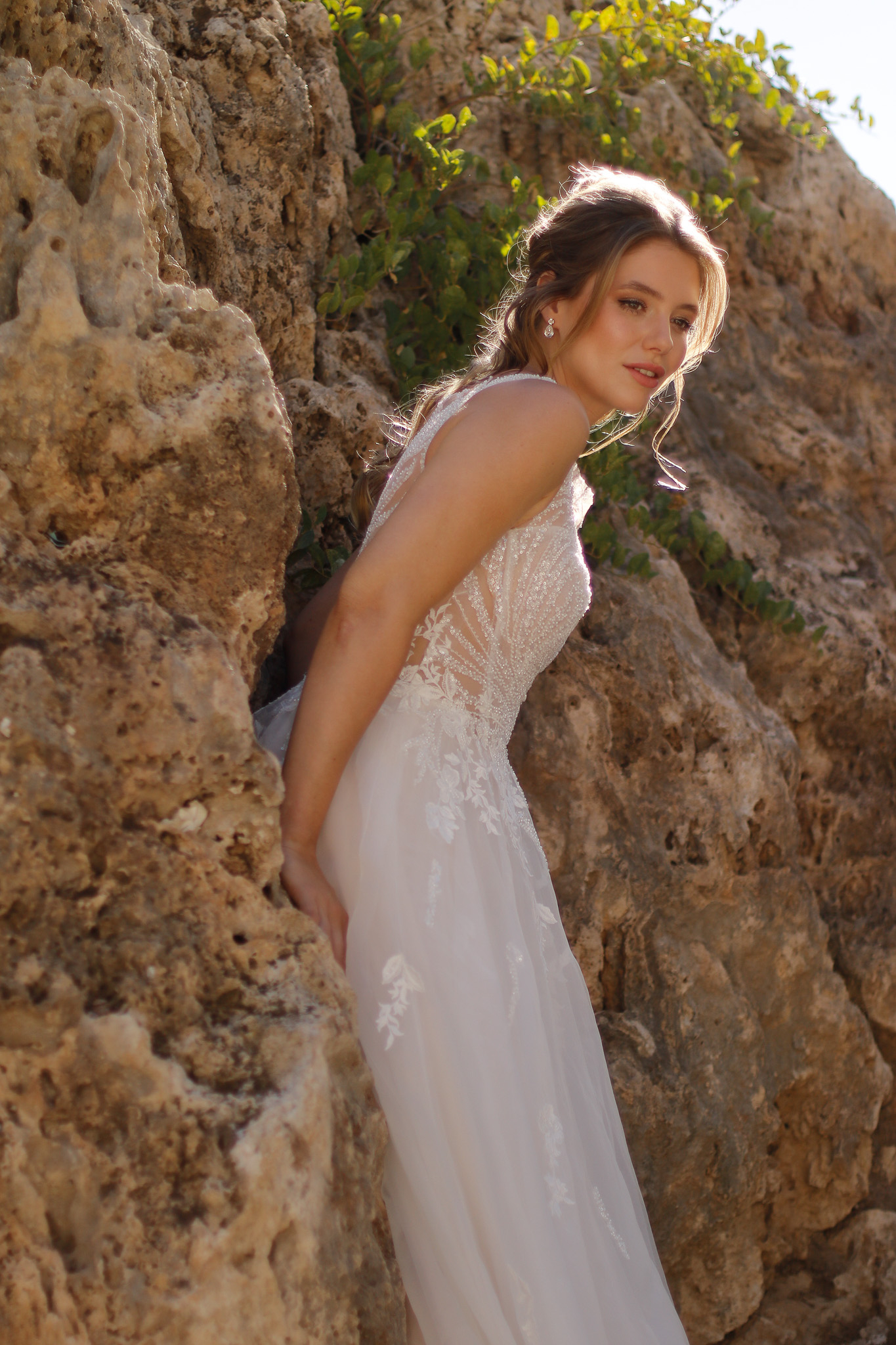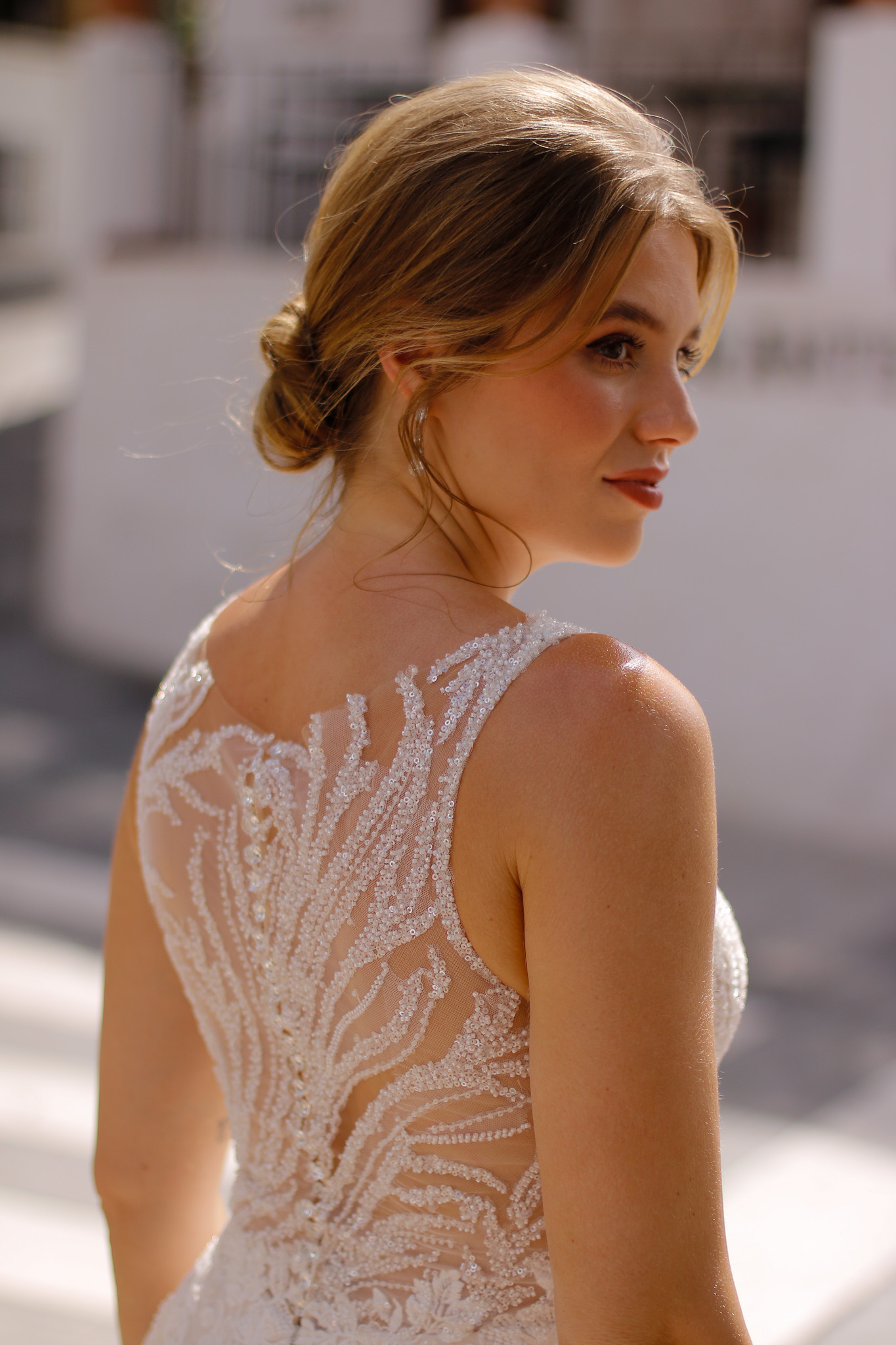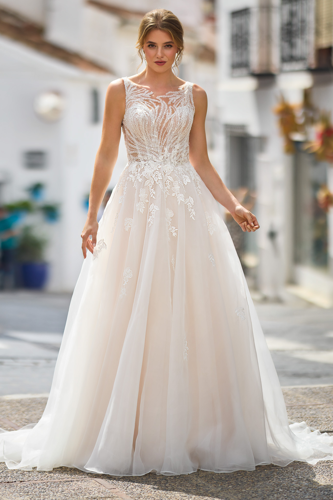 Gorgeous layers of organza fabric create this elegant champagne colored A-line wedding dress. The bodice has a high neckline created with a pattern of beading and sequins on a nude tulle panel, that also creates the amazing back detail. The dress is finished with a romantic flowing train. See all material details